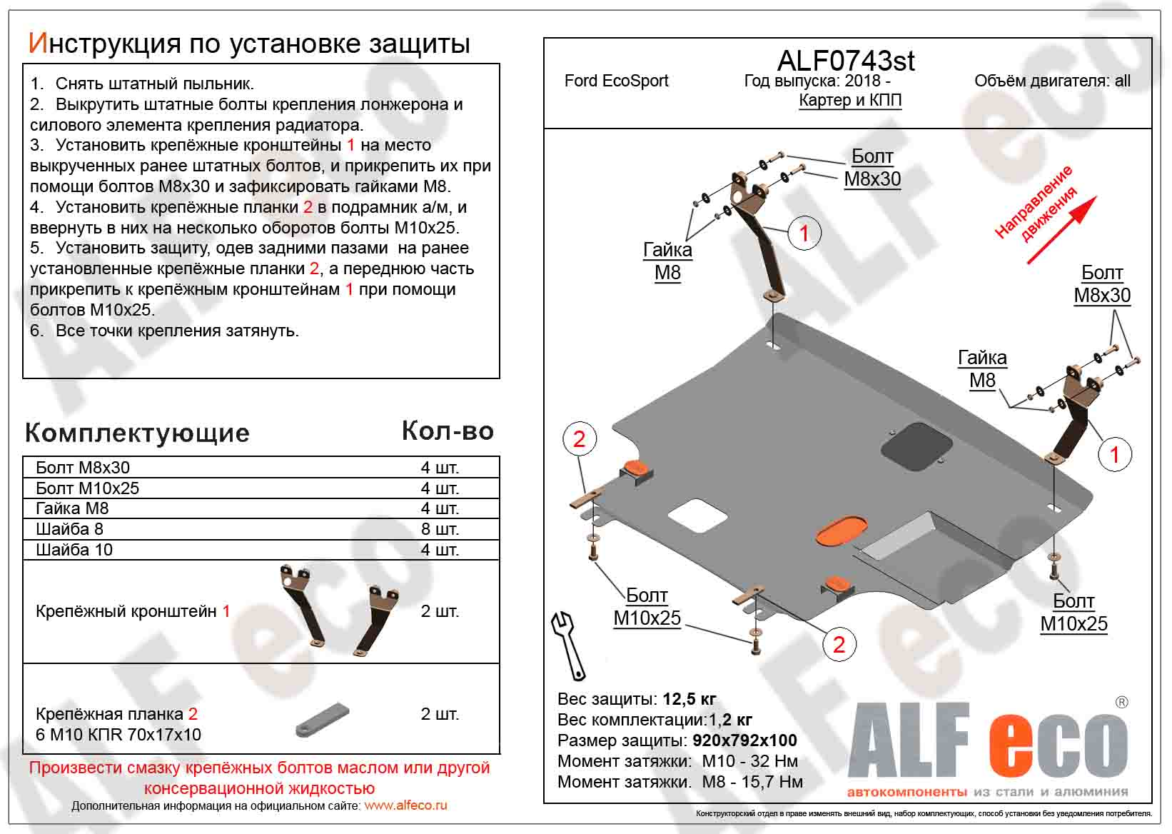 Защита картера и КПП ALFeco арт. ALF0743al изготовлена из алюминия толщиной 4мм специально для автомобиля Ford Eco Sport 2018-. Обеспечивает надежную защиту агрегатов от механических повреждений и попадания дорожной грязи и других предметов, встречающихся на проезжей части, способных зачастую нанести серьезный вред автомобилю. В комплекте идет весь необходимый крепеж для установки. Наличие можно уточнить по телефону. Возможна установка в нашем автосервисе по предварительной записи