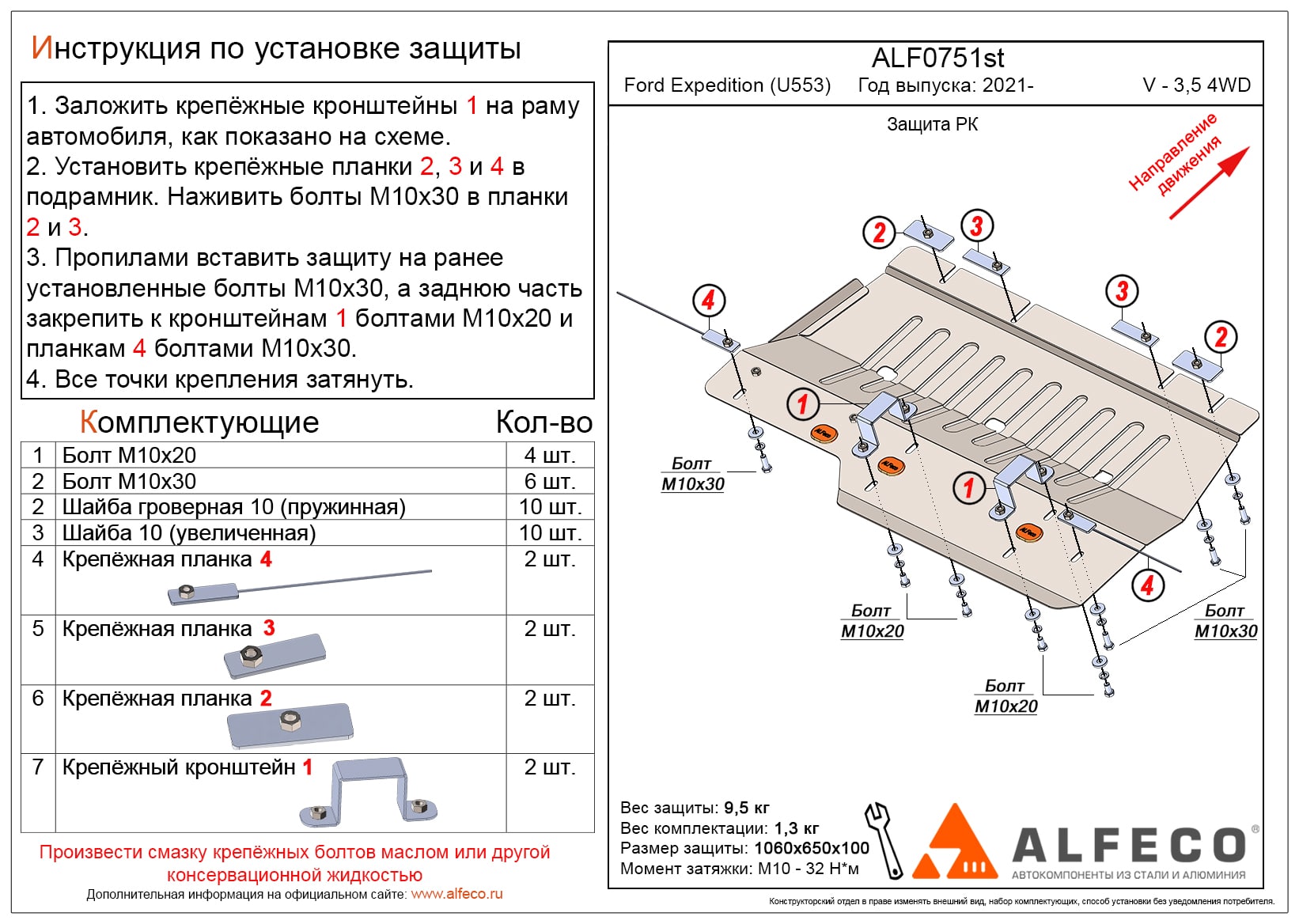 Защита РК ALFeco арт. ALF0751al изготовлена из алюминия толщиной 4 мм специально для автомобиля Ford Expedition (U553) 2021- . Обеспечивает надежную защиту агрегатов от механических повреждений и попадания дорожной грязи и других предметов, встречающихся на проезжей части, способных зачастую нанести серьезный вред автомобилю. В комплекте идет весь необходимый крепеж для установки. Наличие можно уточнить по телефону. Возможна установка в нашем автосервисе по предварительной записи
