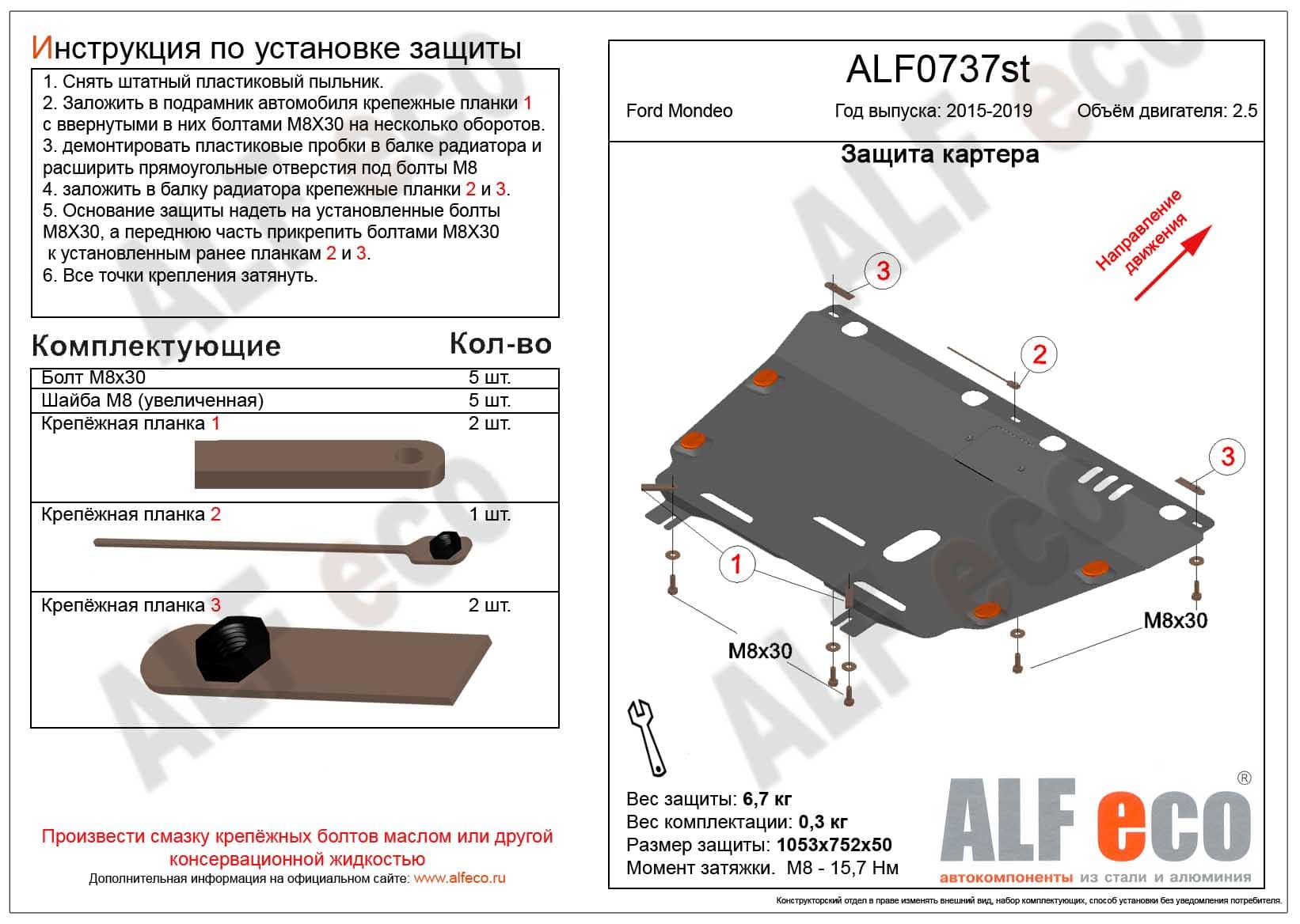 Защита картера и КПП ALFeco арт. ALF0737al изготовлена из алюминия толщиной 4мм специально для автомобиля Ford Mondeo V 2015-2019. Обеспечивает надежную защиту агрегатов от механических повреждений и попадания дорожной грязи и других предметов, встречающихся на проезжей части, способных зачастую нанести серьезный вред автомобилю. В комплекте идет весь необходимый крепеж для установки. Наличие можно уточнить по телефону. Возможна установка в нашем автосервисе по предварительной записи