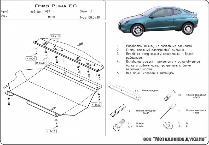Защита картера и КПП 08.0439 Sheriff изготовлена из стали толщиной 2 мм. Устанавливается на FORD Puma в штатные места с помощью прилагаемого набора крепежа. Защита картера и КПП предотвращает механические повреждения, а также попадание грязи и влаги на данный агрегат.