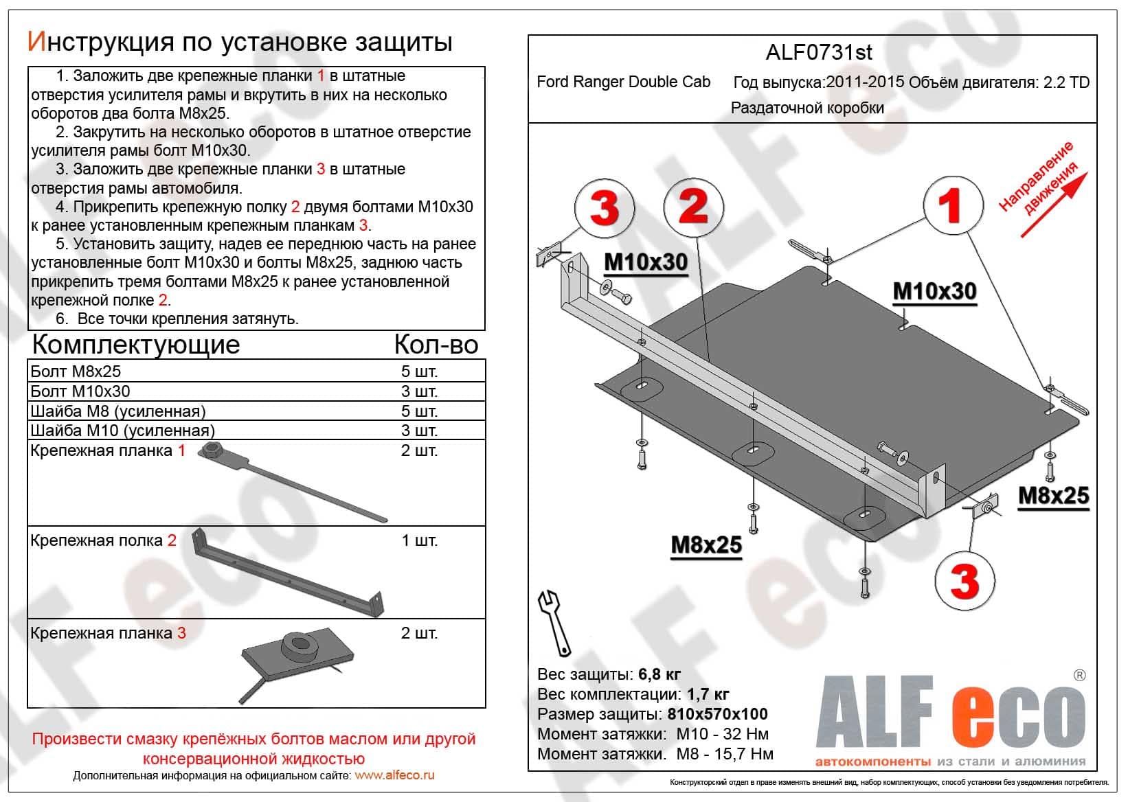 Защита РК ALFeco арт. ALF0731st изготовлена из стали толщиной 2мм специально для автомобиля Ford Ranger III 2011-2015. Обеспечивает надежную защиту агрегатов от механических повреждений и попадания дорожной грязи и других предметов, встречающихся на проезжей части, способных зачастую нанести серьезный вред автомобилю. В комплекте идет весь необходимый крепеж для установки. Наличие можно уточнить по телефону. Возможна установка в нашем автосервисе по предварительной записи