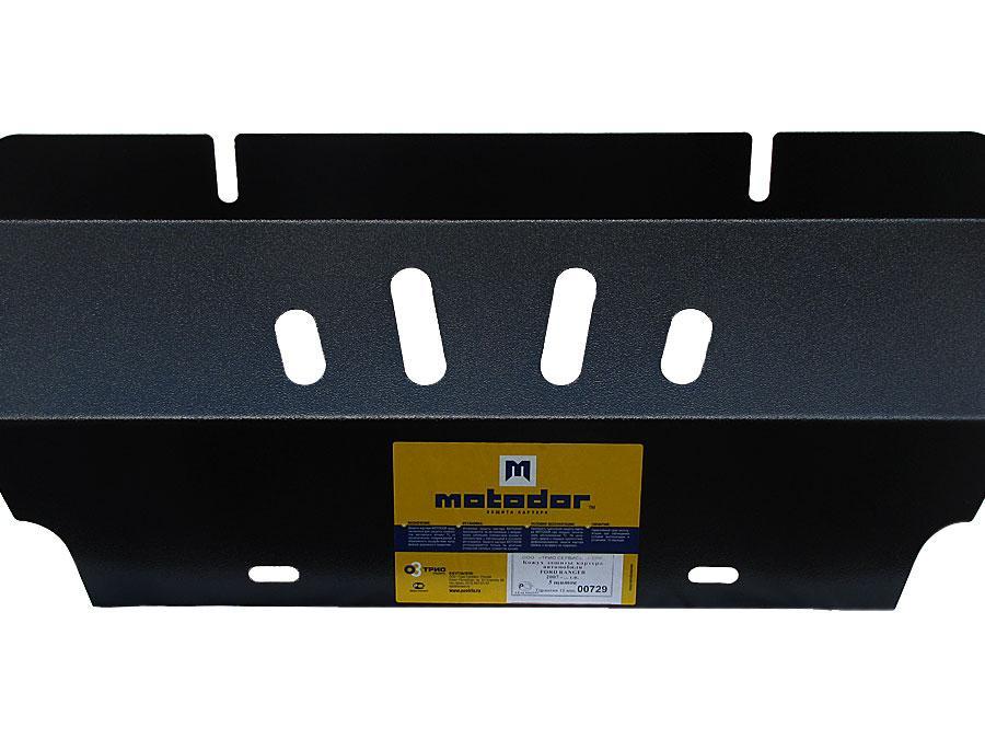 Защита двигателя, переднего дифференциала, коробки переключения передач, радиатора, раздаточной коробки Motodor 00729 изготовлена из стали толщиной 2 мм специально для автомобиля Ford Ranger 2006-2012.