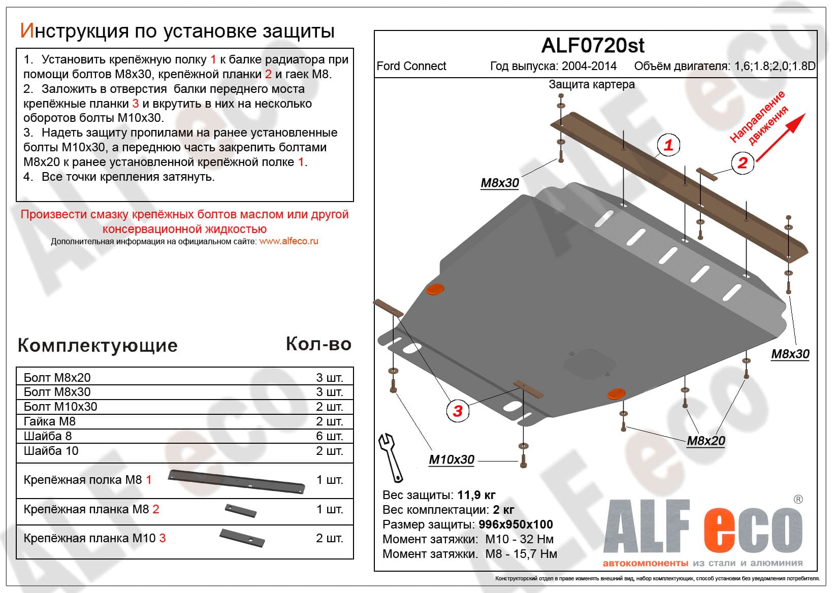Защита картера и КПП ALFeco арт. ALF0720st изготовлена из стали толщиной 2мм специально для автомобиля Ford Transit Connect 2004-2014. Обеспечивает надежную защиту агрегатов от механических повреждений и попадания дорожной грязи и других предметов, встречающихся на проезжей части, способных зачастую нанести серьезный вред автомобилю. В комплекте идет весь необходимый крепеж для установки. Наличие можно уточнить по телефону. Возможна установка в нашем автосервисе по предварительной записи