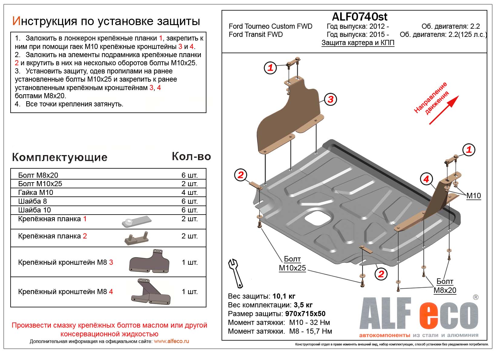 Защита картера и КПП ALFeco арт. ALF0740st-1 изготовлена из стали толщиной 2мм специально для автомобиля Ford Transit FWD 2015-2022. Обеспечивает надежную защиту агрегатов от механических повреждений и попадания дорожной грязи и других предметов, встречающихся на проезжей части, способных зачастую нанести серьезный вред автомобилю. В комплекте идет весь необходимый крепеж для установки. Наличие можно уточнить по телефону. Возможна установка в нашем автосервисе по предварительной записи