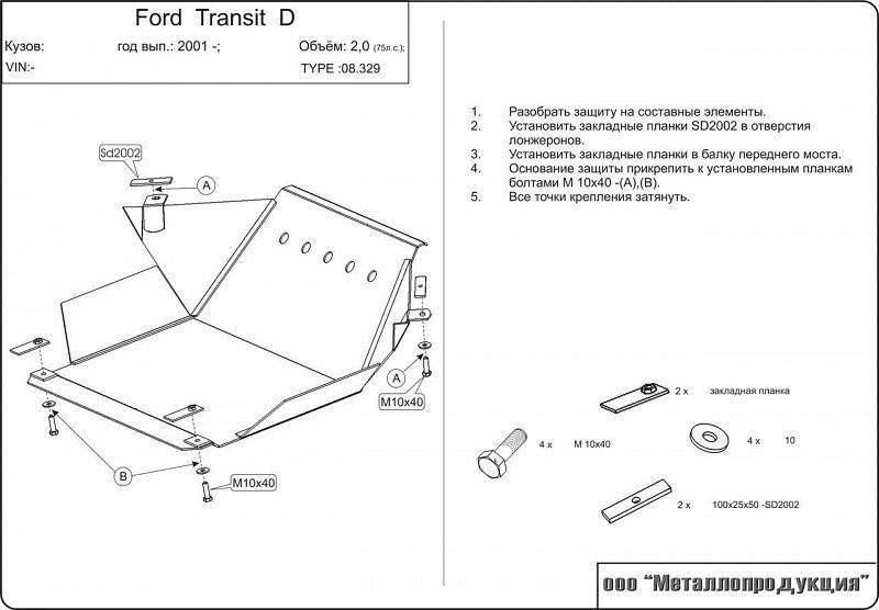 Стальная защита картера Sheriff арт. 08.0329 толщиной 2,0 мм специально для автомобиля Ford Transit . Обеспечивает надежную защиту агрегатов от механических повреждений и попадания дорожной грязи и других предметов, встречающихся на проезжей части, способных зачастую нанести серьезный вред автомобилю. В комплекте идет весь необходимый крепеж для установки. Срок поставки защиты составляет 1-3 дня, наличие можно уточнить по телефону. Возможна установка в нашем автосервисе по предварительной записи