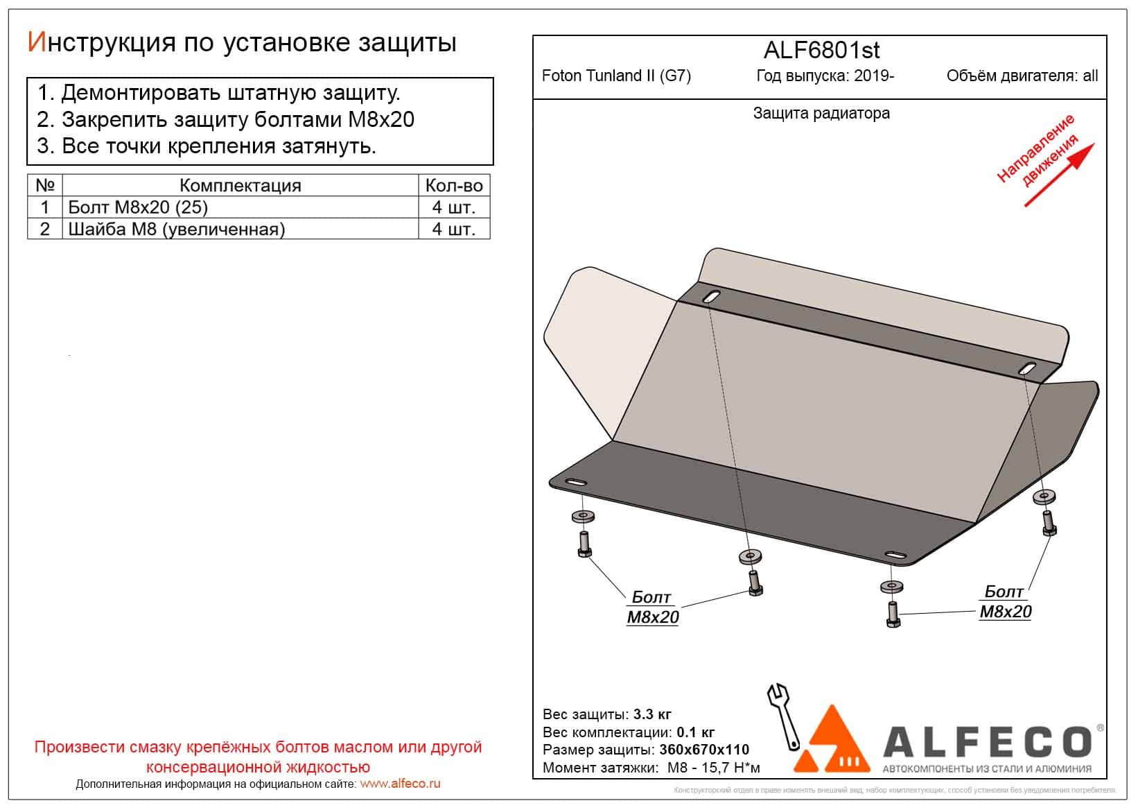 Защита радиатора ALFeco арт. ALF6801st изготовлена из стали толщиной 2мм специально для автомобиля Foton Tunland II (G7) 2019-. Обеспечивает надежную защиту агрегатов от механических повреждений и попадания дорожной грязи и других предметов, встречающихся на проезжей части, способных зачастую нанести серьезный вред автомобилю.