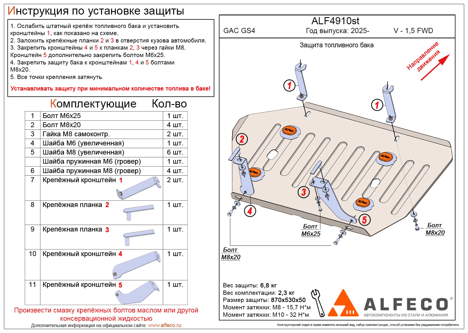 Защита топливного бака ALFeco арт. ALF4910al изготовлена из алюминия толщиной 4 мм специально для автомобиля GAC GS4 2025- . Обеспечивает надежную защиту агрегатов от механических повреждений и попадания дорожной грязи и других предметов, встречающихся на проезжей части, способных зачастую нанести серьезный вред автомобилю. В комплекте идет весь необходимый крепеж для установки. Наличие можно уточнить по телефону. Возможна установка в нашем автосервисе по предварительной записи