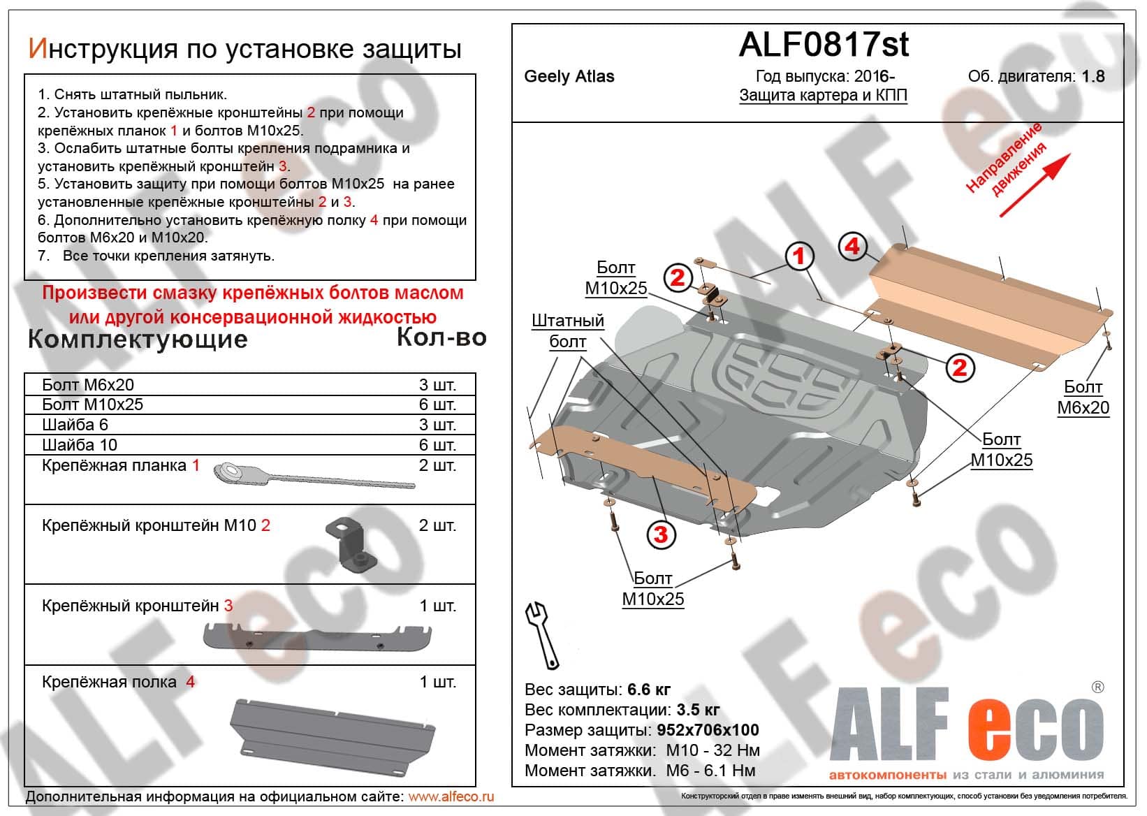 Защита картера и КПП ALFeco арт. ALF0817st изготовлена из стали толщиной 2мм специально для автомобиля Geely Atlas 2016-2022. Обеспечивает надежную защиту агрегатов от механических повреждений и попадания дорожной грязи и других предметов, встречающихся на проезжей части, способных зачастую нанести серьезный вред автомобилю. В комплекте идет весь необходимый крепеж для установки. Наличие можно уточнить по телефону. Возможна установка в нашем автосервисе по предварительной записи