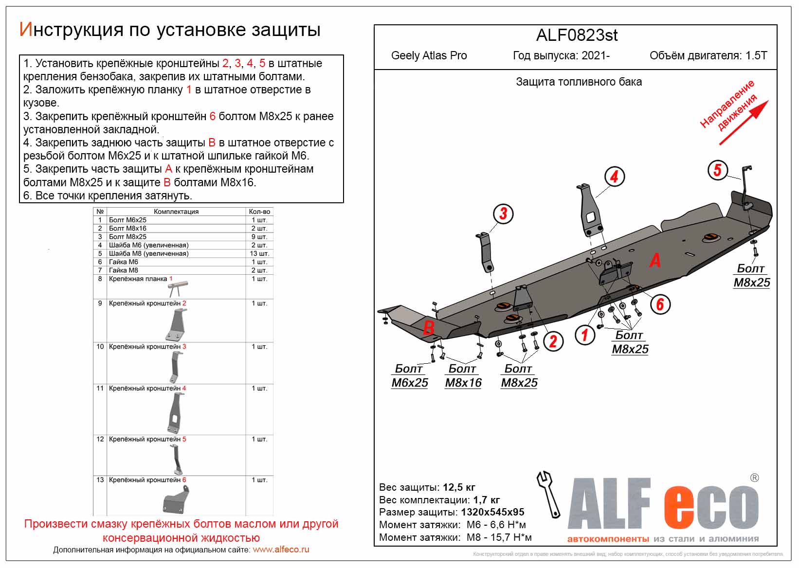 Защита топлвиного бака 2 части ALFeco арт. ALF0823al изготовлена из алюминия толщиной 4мм специально для автомобиля Geely Atlas Pro 2021-. Обеспечивает надежную защиту агрегатов от механических повреждений и попадания дорожной грязи и других предметов, встречающихся на проезжей части, способных зачастую нанести серьезный вред автомобилю. В комплекте идет весь необходимый крепеж для установки. Наличие можно уточнить по телефону. Возможна установка в нашем автосервисе по предварительной записи