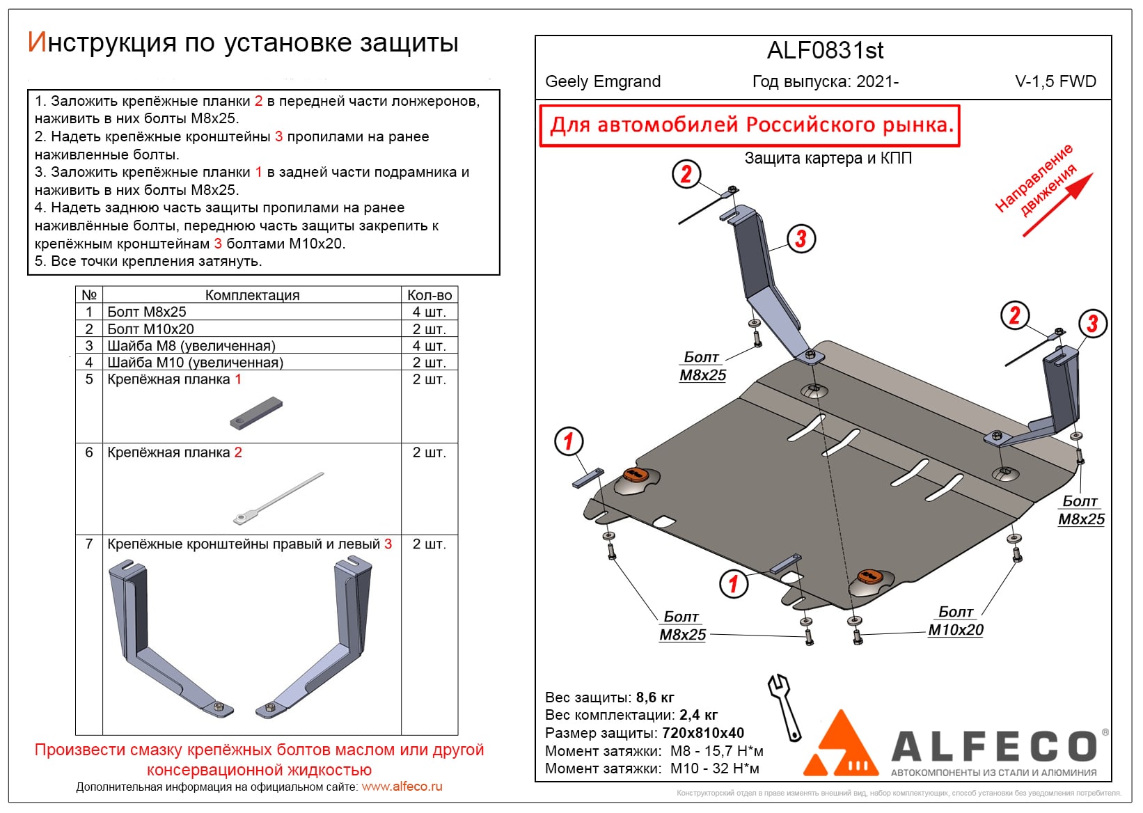Защита картера и КПП ALFeco арт. ALF0831st изготовлена из стали толщиной 2мм специально для автомобиля Geely Emgrand 2021-. Обеспечивает надежную защиту агрегатов от механических повреждений и попадания дорожной грязи и других предметов, встречающихся на проезжей части, способных зачастую нанести серьезный вред автомобилю. В комплекте идет весь необходимый крепеж для установки. Наличие можно уточнить по телефону. Возможна установка в нашем автосервисе по предварительной записи
