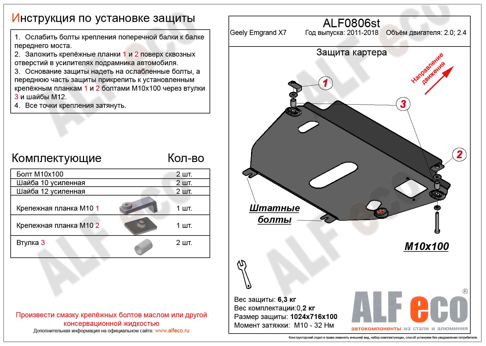 Защита картера и КПП (установка на пыльник) ALFeco арт. ALF0806al изготовлена из алюминия толщиной 4мм специально для автомобиля Geely Emgrand X7 2013-2021. Обеспечивает надежную защиту агрегатов от механических повреждений и попадания дорожной грязи и других предметов, встречающихся на проезжей части, способных зачастую нанести серьезный вред автомобилю. В комплекте идет весь необходимый крепеж для установки. Наличие можно уточнить по телефону. Возможна установка в нашем автосервисе по предварительной записи