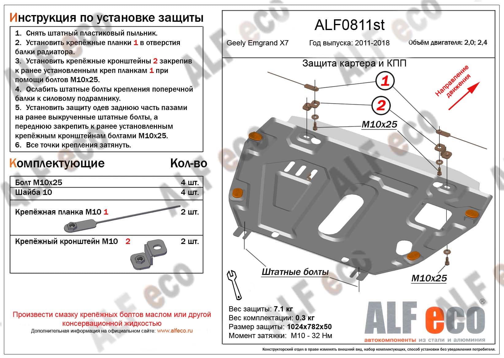 Защита картера и КПП (установка без пыльника) ALFeco арт. ALF0811al изготовлена из алюминия толщиной 4мм специально для автомобиля Geely Emgrand X7 2013-2021. Обеспечивает надежную защиту агрегатов от механических повреждений и попадания дорожной грязи и других предметов, встречающихся на проезжей части, способных зачастую нанести серьезный вред автомобилю. В комплекте идет весь необходимый крепеж для установки. Наличие можно уточнить по телефону. Возможна установка в нашем автосервисе по предварительной записи