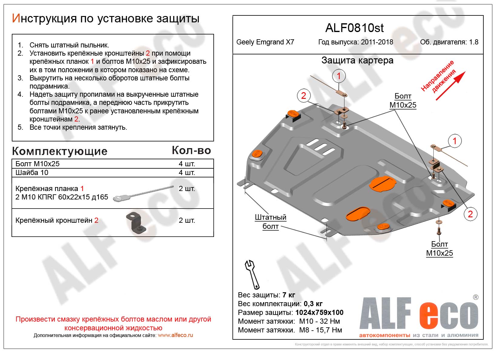 Защита картера и КПП ALFeco арт. ALF0810st изготовлена из стали толщиной 2мм специально для автомобиля Geely Emgrand X7 2016-2021. Обеспечивает надежную защиту агрегатов от механических повреждений и попадания дорожной грязи и других предметов, встречающихся на проезжей части, способных зачастую нанести серьезный вред автомобилю. В комплекте идет весь необходимый крепеж для установки. Наличие можно уточнить по телефону. Возможна установка в нашем автосервисе по предварительной записи