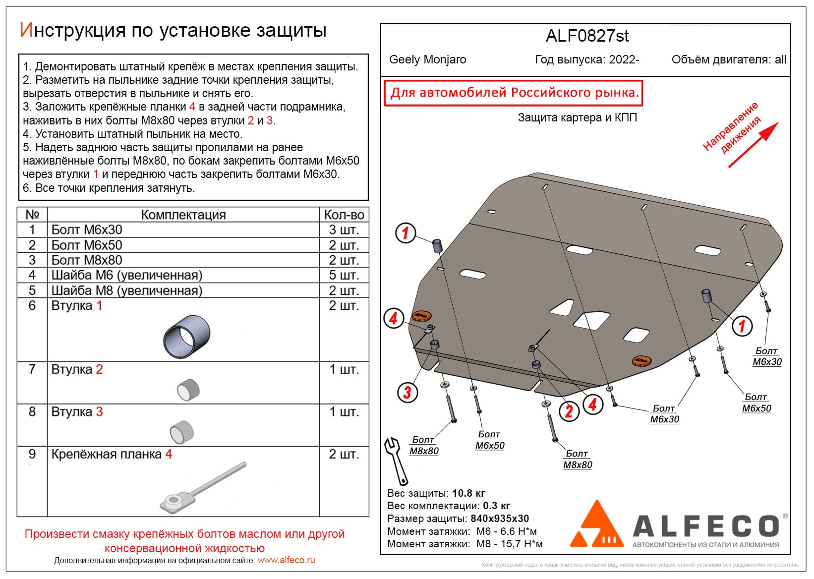 Защита картера и КПП ALFeco арт. ALF0827st изготовлена из стали толщиной 2мм специально для автомобиля Geely Monjaro 2022-. Обеспечивает надежную защиту агрегатов от механических повреждений и попадания дорожной грязи и других предметов, встречающихся на проезжей части, способных зачастую нанести серьезный вред автомобилю. В комплекте идет весь необходимый крепеж для установки. Наличие можно уточнить по телефону. Возможна установка в нашем автосервисе по предварительной записи