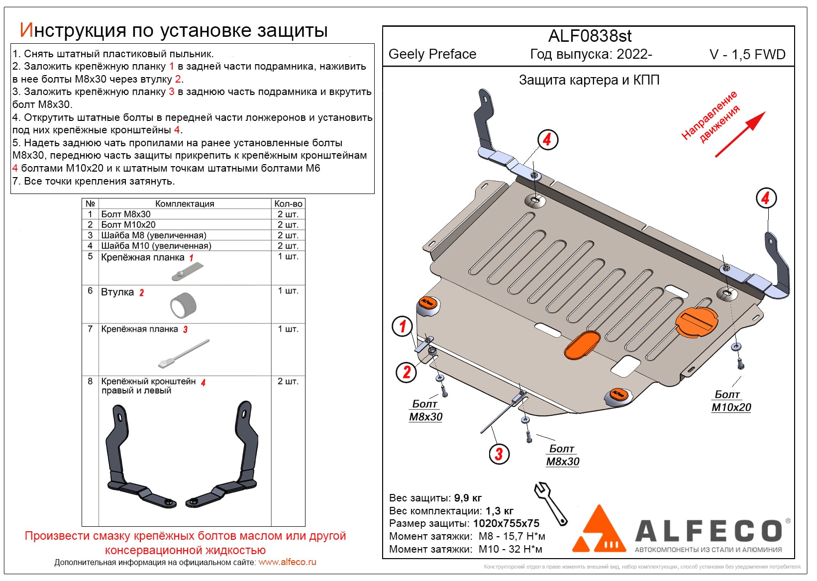 Защита картера и КПП ALFeco арт. ALF0838al изготовлена из алюминия толщиной 4мм специально для автомобиля Geely Preface 2024-. Обеспечивает надежную защиту агрегатов от механических повреждений и попадания дорожной грязи и других предметов, встречающихся на проезжей части, способных зачастую нанести серьезный вред автомобилю. В комплекте идет весь необходимый крепеж для установки. Наличие можно уточнить по телефону. Возможна установка в нашем автосервисе по предварительной записи