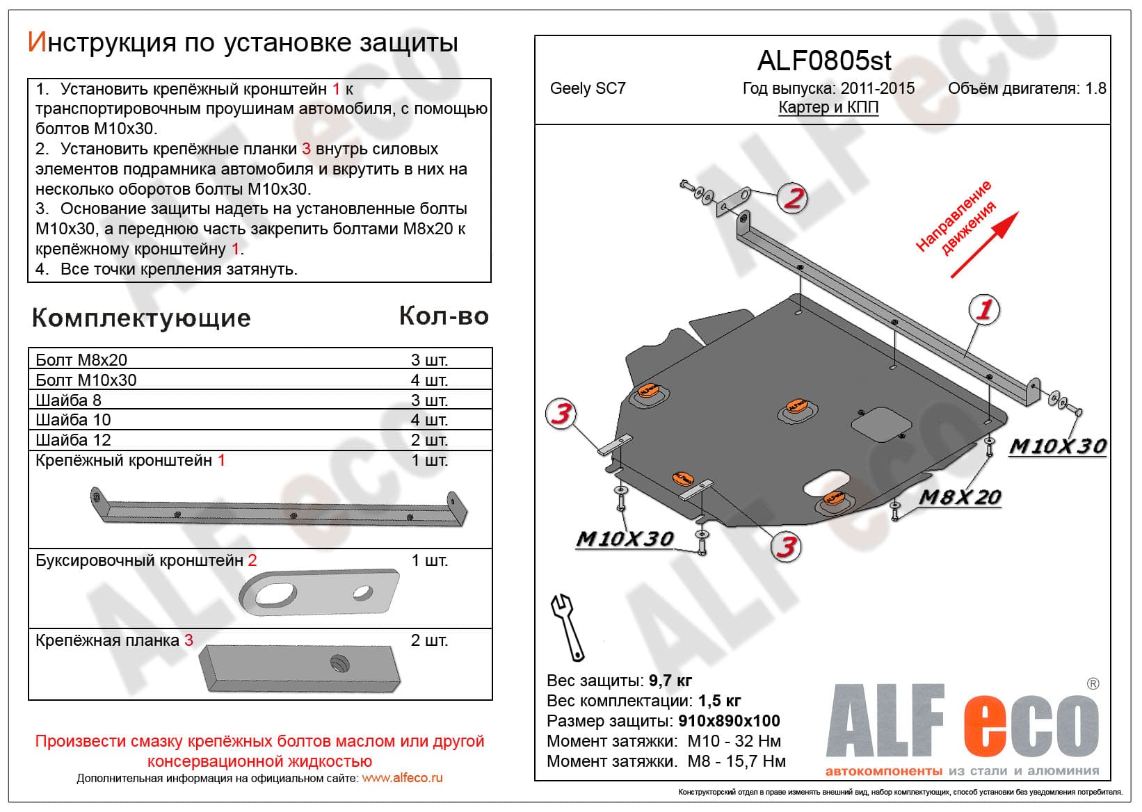 Защита картера и КПП ALFeco арт. ALF0805al изготовлена из алюминия толщиной 4мм специально для автомобиля Geely SC7 2011-2015. Обеспечивает надежную защиту агрегатов от механических повреждений и попадания дорожной грязи и других предметов, встречающихся на проезжей части, способных зачастую нанести серьезный вред автомобилю. В комплекте идет весь необходимый крепеж для установки. Наличие можно уточнить по телефону. Возможна установка в нашем автосервисе по предварительной записи