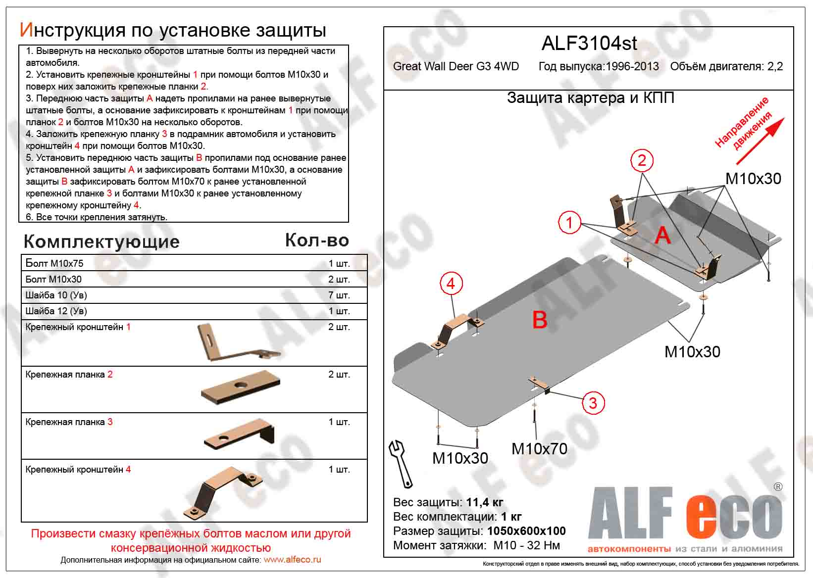 Защита картера и КПП (2 части) ALFeco арт. ALF3104st изготовлена из стали толщиной 2мм специально для автомобиля Deer 2005-2010. Обеспечивает надежную защиту агрегатов от механических повреждений и попадания дорожной грязи и других предметов, встречающихся на проезжей части, способных зачастую нанести серьезный вред автомобилю. В комплекте идет весь необходимый крепеж для установки. Наличие можно уточнить по телефону. Возможна установка в нашем автосервисе по предварительной записи