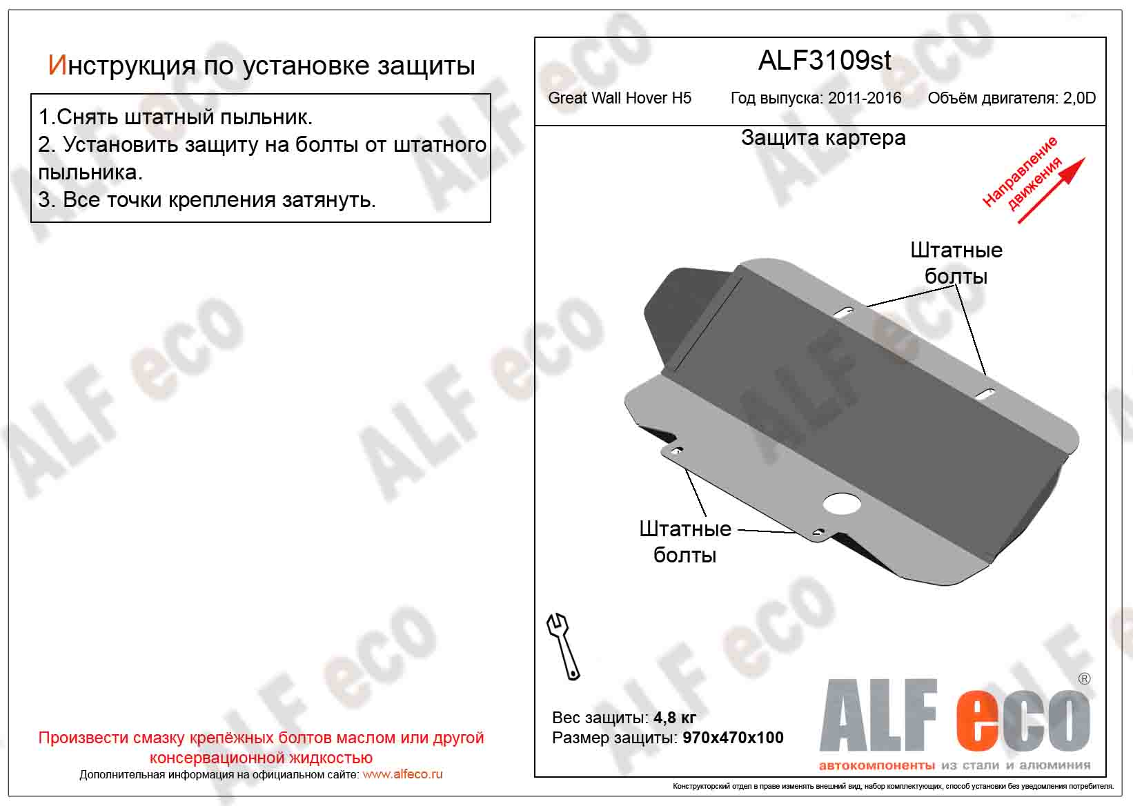 Защита картера ALFeco арт. ALF3109al изготовлена из алюминия толщиной 4мм специально для автомобиля Hover H5 2011-2016. Обеспечивает надежную защиту агрегатов от механических повреждений и попадания дорожной грязи и других предметов, встречающихся на проезжей части, способных зачастую нанести серьезный вред автомобилю. В комплекте идет весь необходимый крепеж для установки. Наличие можно уточнить по телефону. Возможна установка в нашем автосервисе по предварительной записи