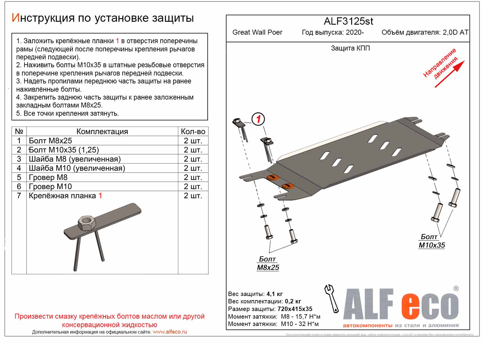 Защита КПП ALFeco арт. ALF3125al изготовлена из алюминия толщиной 4мм специально для автомобиля Great Wall Poer 2020-. Обеспечивает надежную защиту агрегатов от механических повреждений и попадания дорожной грязи и других предметов, встречающихся на проезжей части, способных зачастую нанести серьезный вред автомобилю. В комплекте идет весь необходимый крепеж для установки. Наличие можно уточнить по телефону. Возможна установка в нашем автосервисе по предварительной записи