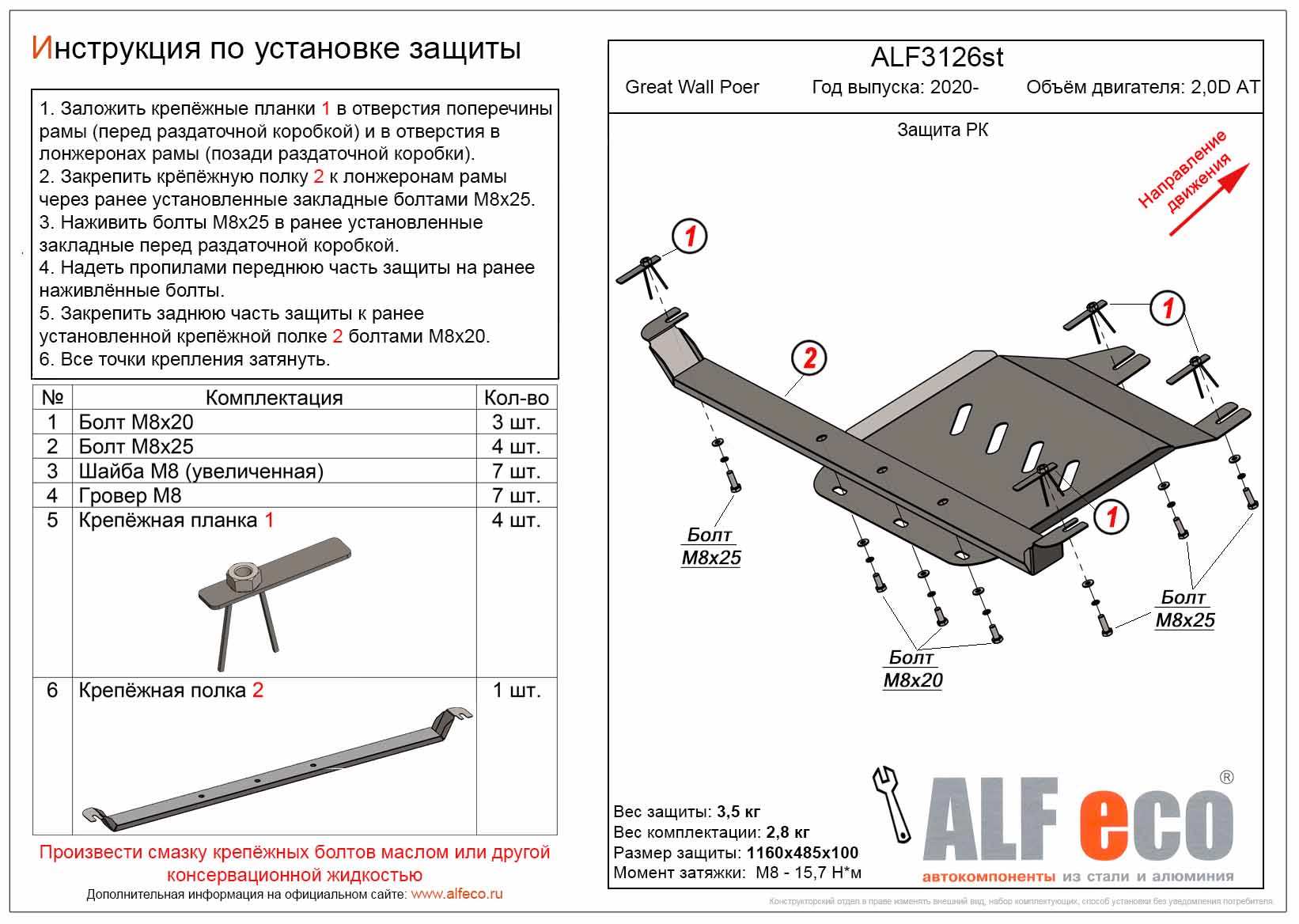 Защита РК ALFeco арт. ALF3126al изготовлена из алюминия толщиной 4мм специально для автомобиля Great Wall Poer 2020-. Обеспечивает надежную защиту агрегатов от механических повреждений и попадания дорожной грязи и других предметов, встречающихся на проезжей части, способных зачастую нанести серьезный вред автомобилю. В комплекте идет весь необходимый крепеж для установки. Наличие можно уточнить по телефону. Возможна установка в нашем автосервисе по предварительной записи