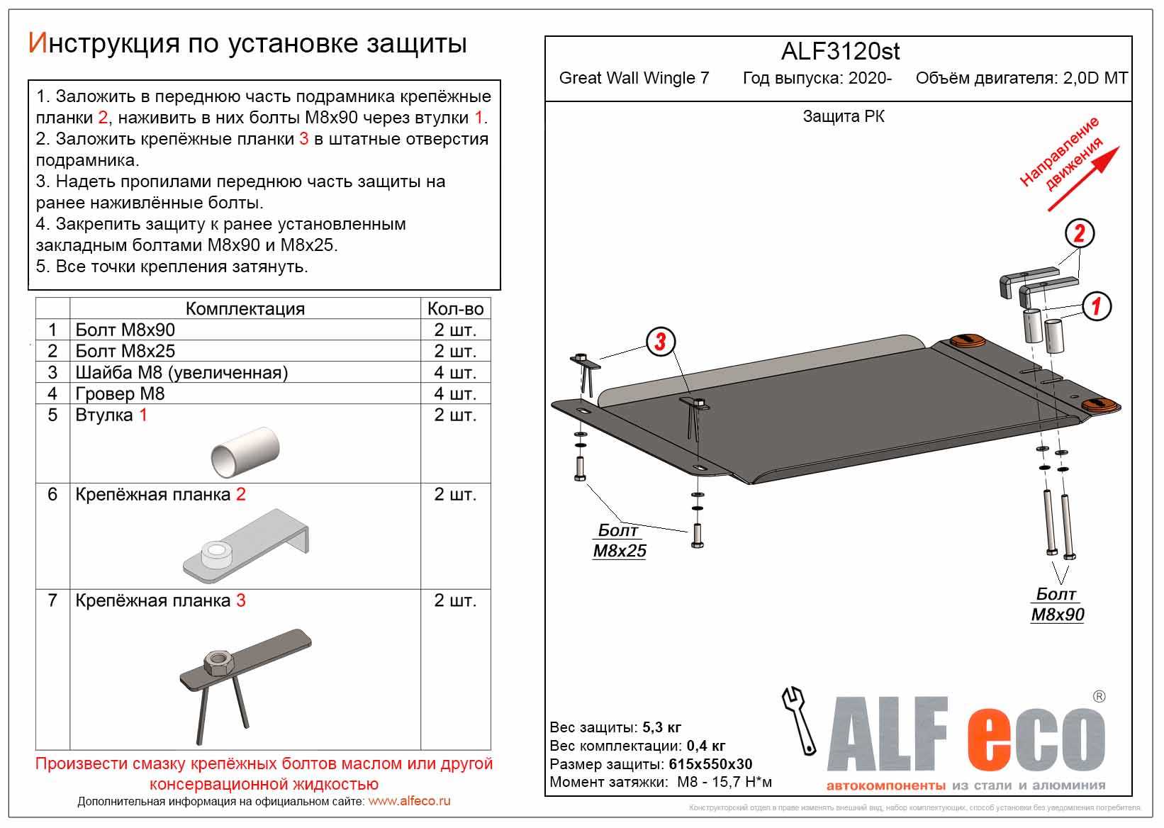 Защита РК ALFeco арт. ALF3120al изготовлена из алюминия толщиной 4мм специально для автомобиля Great Wall Wingle 7 2020-. Обеспечивает надежную защиту агрегатов от механических повреждений и попадания дорожной грязи и других предметов, встречающихся на проезжей части, способных зачастую нанести серьезный вред автомобилю. В комплекте идет весь необходимый крепеж для установки. Наличие можно уточнить по телефону. Возможна установка в нашем автосервисе по предварительной записи