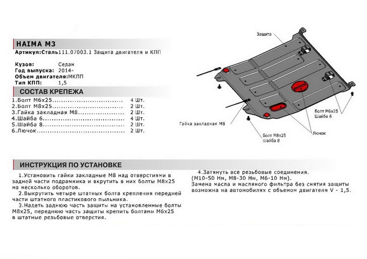 Приобретая стальную защиту 111.07003.1 АвтоБроня , вы можете установить ее в нашем сервисе. Стоимость установки составляет 1100 рублей, предварительно необходимо записаться по телефону на удобное для вас время.