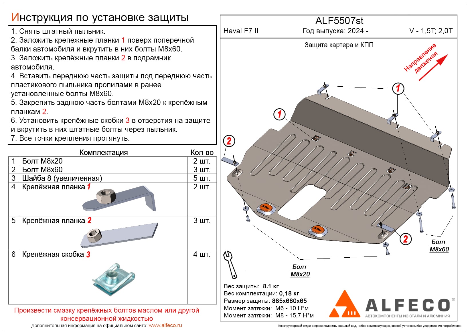 Защита картера и КПП ALFeco арт. ALF5507al изготовлена из алюминия толщиной 4мм специально для автомобиля Haval F7 II 2024-. Обеспечивает надежную защиту агрегатов от механических повреждений и попадания дорожной грязи и других предметов, встречающихся на проезжей части, способных зачастую нанести серьезный вред автомобилю. В комплекте идет весь необходимый крепеж для установки. Наличие можно уточнить по телефону. Возможна установка в нашем автосервисе по предварительной записи