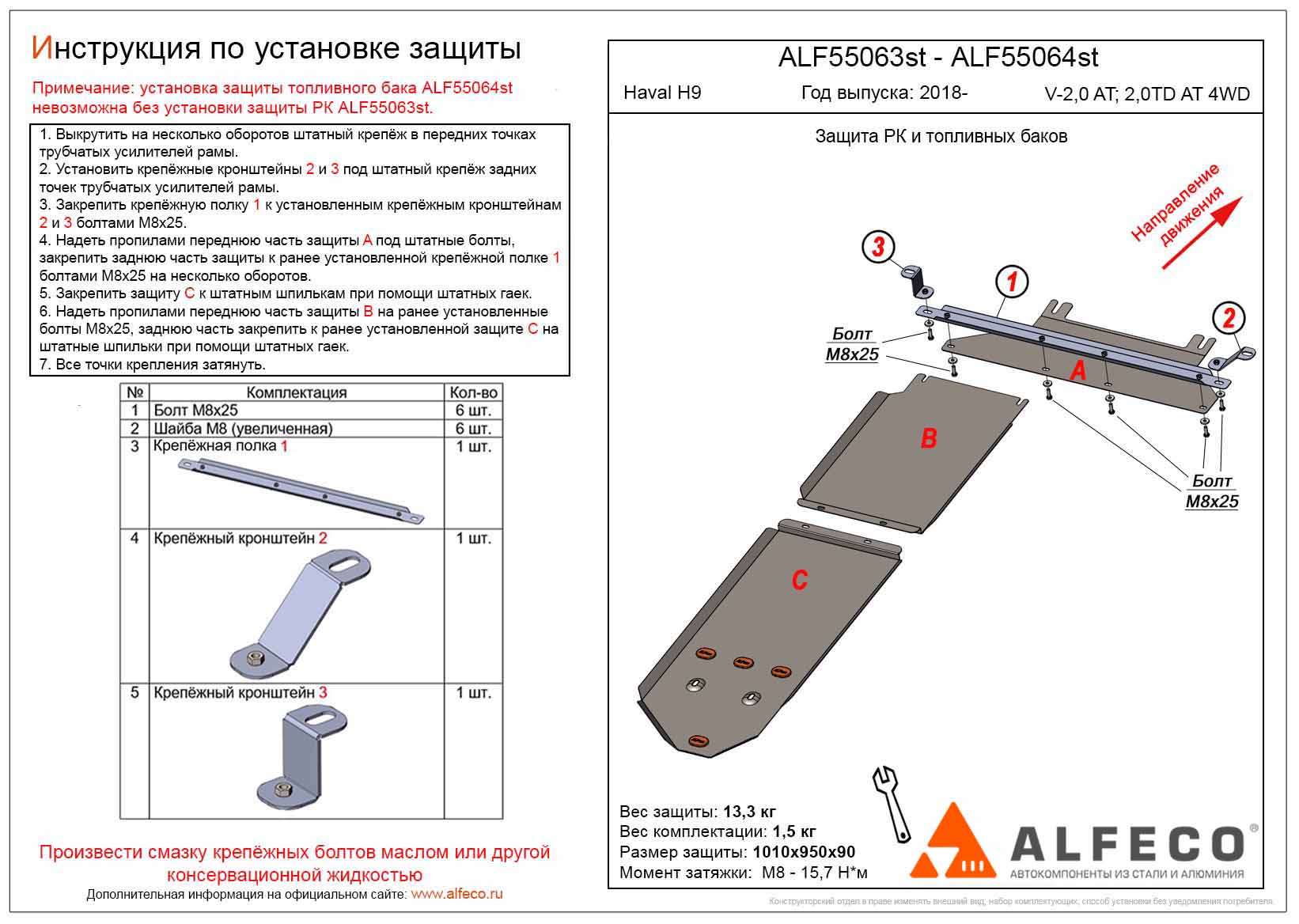 Защита топливного бака (2 части) установка невозможна без ALF55063st ALFeco арт. ALF55064st изготовлена из стали толщиной 2мм специально для автомобиля Haval H9 2018-. Обеспечивает надежную защиту агрегатов от механических повреждений и попадания дорожной грязи и других предметов, встречающихся на проезжей части, способных зачастую нанести серьезный вред автомобилю. В комплекте идет весь необходимый крепеж для установки. Наличие можно уточнить по телефону. Возможна установка в нашем автосервисе по предварительной записи