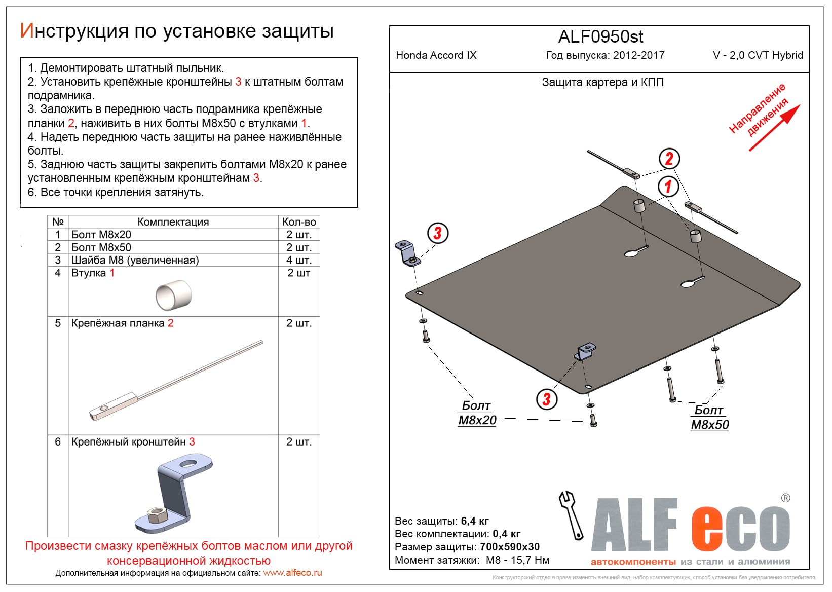Защита картера и КПП ALFeco арт. ALF0950al изготовлена из алюминия толщиной 4мм специально для автомобиля Honda Accord IX 2012-2017. Обеспечивает надежную защиту агрегатов от механических повреждений и попадания дорожной грязи и других предметов, встречающихся на проезжей части, способных зачастую нанести серьезный вред автомобилю. В комплекте идет весь необходимый крепеж для установки. Наличие можно уточнить по телефону. Возможна установка в нашем автосервисе по предварительной записи
