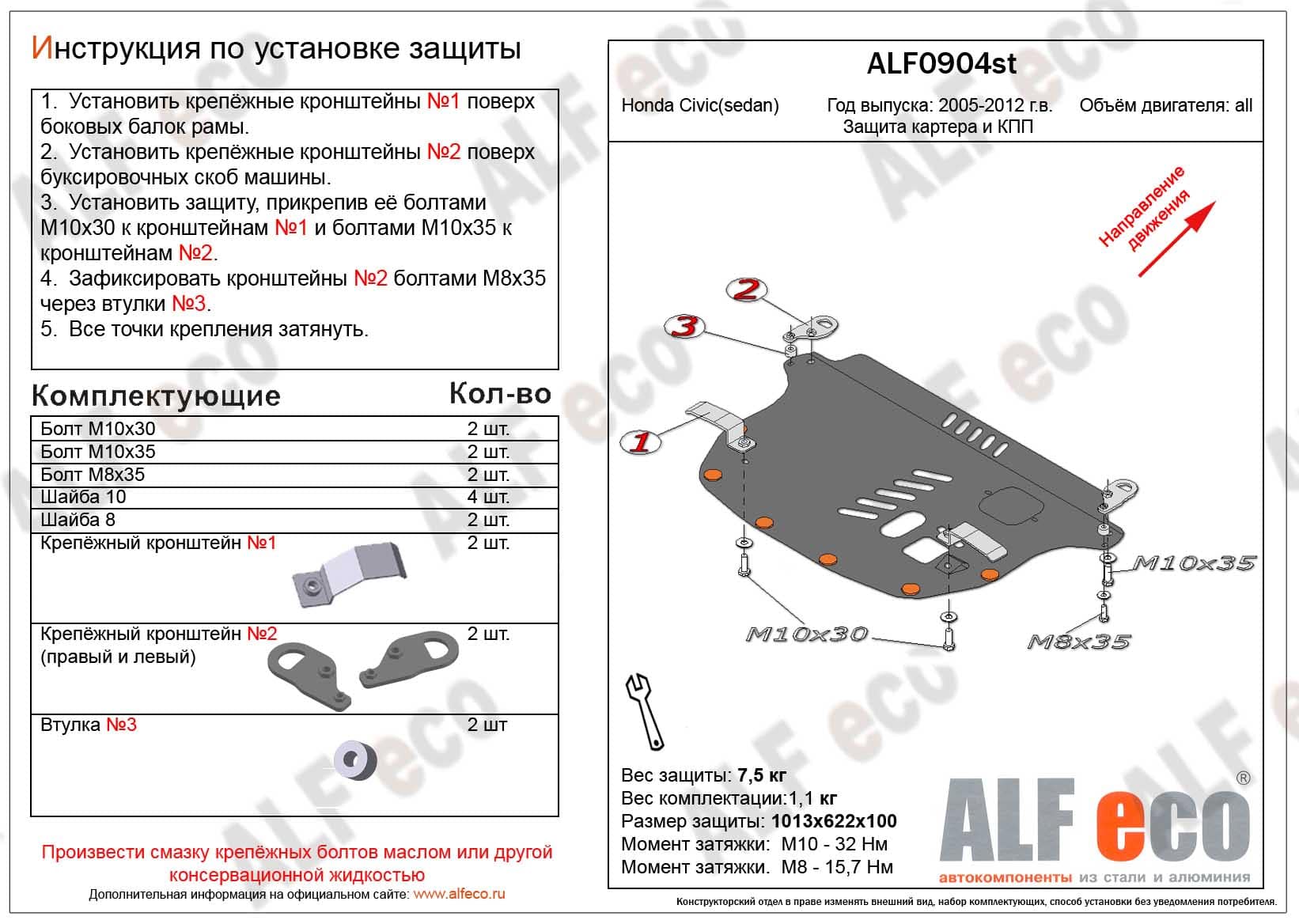 Защита картера и КПП ALFeco арт. ALF0904st изготовлена из стали толщиной 2мм специально для автомобиля Honda Civic VIII (sedan) 2005-2011. Обеспечивает надежную защиту агрегатов от механических повреждений и попадания дорожной грязи и других предметов, встречающихся на проезжей части, способных зачастую нанести серьезный вред автомобилю. В комплекте идет весь необходимый крепеж для установки. Наличие можно уточнить по телефону. Возможна установка в нашем автосервисе по предварительной записи