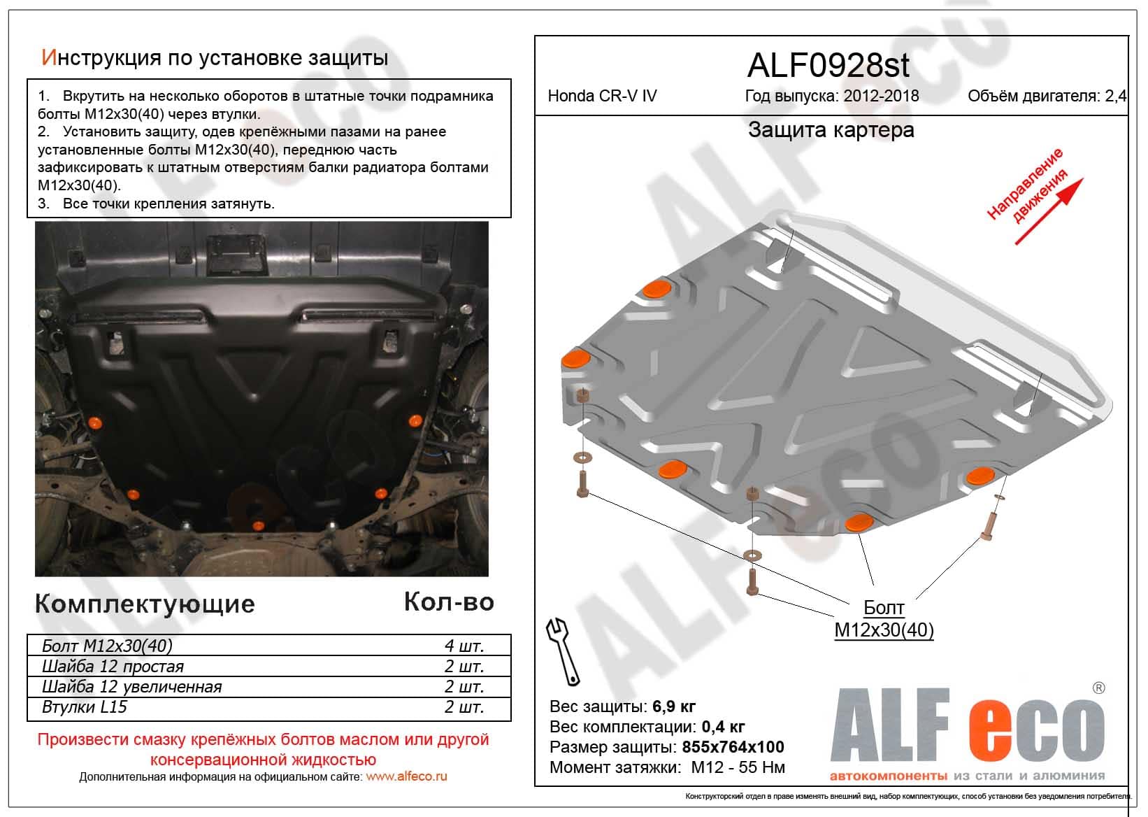 Защита картера и КПП ALFeco арт. ALF0928al изготовлена из алюминия толщиной 4мм специально для автомобиля Honda CR-V IV 2012-2015. Обеспечивает надежную защиту агрегатов от механических повреждений и попадания дорожной грязи и других предметов, встречающихся на проезжей части, способных зачастую нанести серьезный вред автомобилю. В комплекте идет весь необходимый крепеж для установки. Наличие можно уточнить по телефону. Возможна установка в нашем автосервисе по предварительной записи