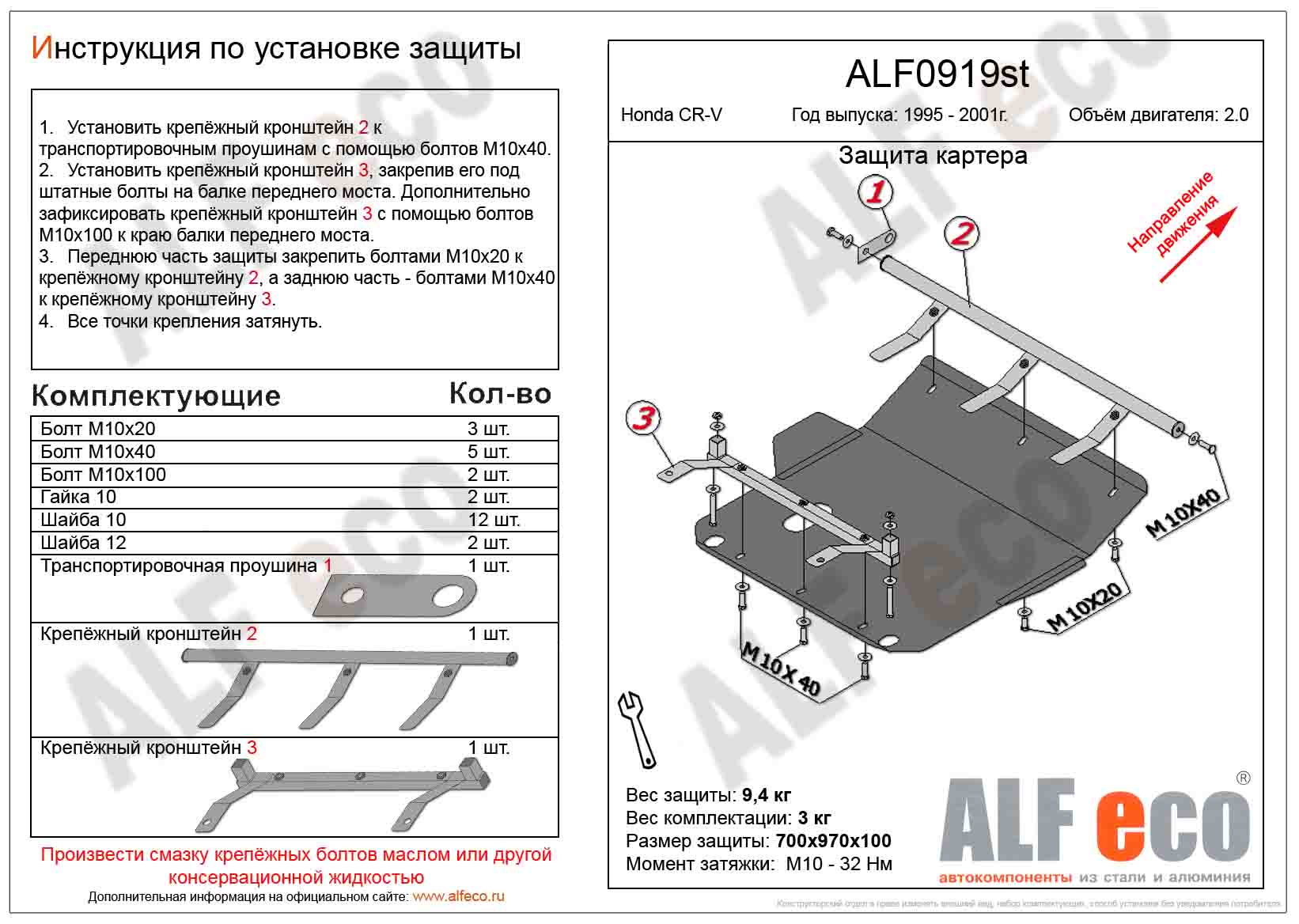Защита картера и КПП ALFeco арт. ALF0919al изготовлена из алюминия толщиной 4мм специально для автомобиля Honda CR-V I 1995-2001. Обеспечивает надежную защиту агрегатов от механических повреждений и попадания дорожной грязи и других предметов, встречающихся на проезжей части, способных зачастую нанести серьезный вред автомобилю. В комплекте идет весь необходимый крепеж для установки. Наличие можно уточнить по телефону. Возможна установка в нашем автосервисе по предварительной записи