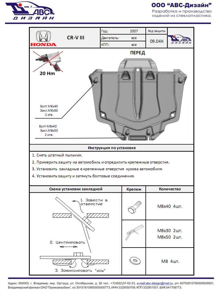 - Официальный представитель: Мы являемся официальными представителями АВС-Дизайн и предлагаем лучшие условия и низкие цены на защиту картера двигателя и КПП для Honda CR-V III 2009-2012 .
