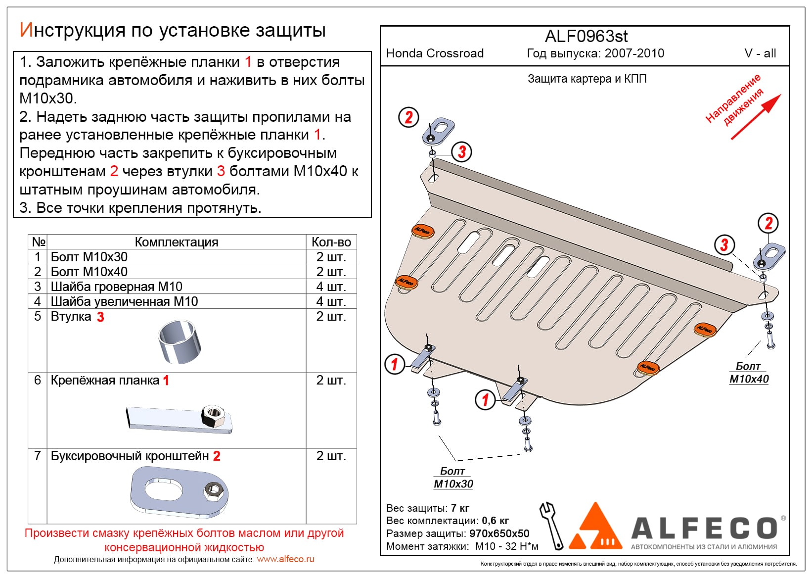 Защита картера и КПП ALFeco арт. ALF0963al изготовлена из алюминия толщиной 4 мм специально для автомобиля Honda Crossroad 2007-2010 . Обеспечивает надежную защиту агрегатов от механических повреждений и попадания дорожной грязи и других предметов, встречающихся на проезжей части, способных зачастую нанести серьезный вред автомобилю. В комплекте идет весь необходимый крепеж для установки. Наличие можно уточнить по телефону. Возможна установка в нашем автосервисе по предварительной записи