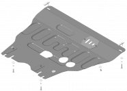 Защита картера и КПП (09.1652) Sheriff изготовлена из стали толщиной 2,0 мм специально для автомобиля HONDA Jazz 2007 - 2013. Данное изделие обеспечивает надежную защиту от механических воздействий, предохраняет подкапотное пространство от попадания грязи и пыли, а также способствует улучшению аэродинамики автомобиля за счет оптимизации обтекаемости моторного отсека снизу.