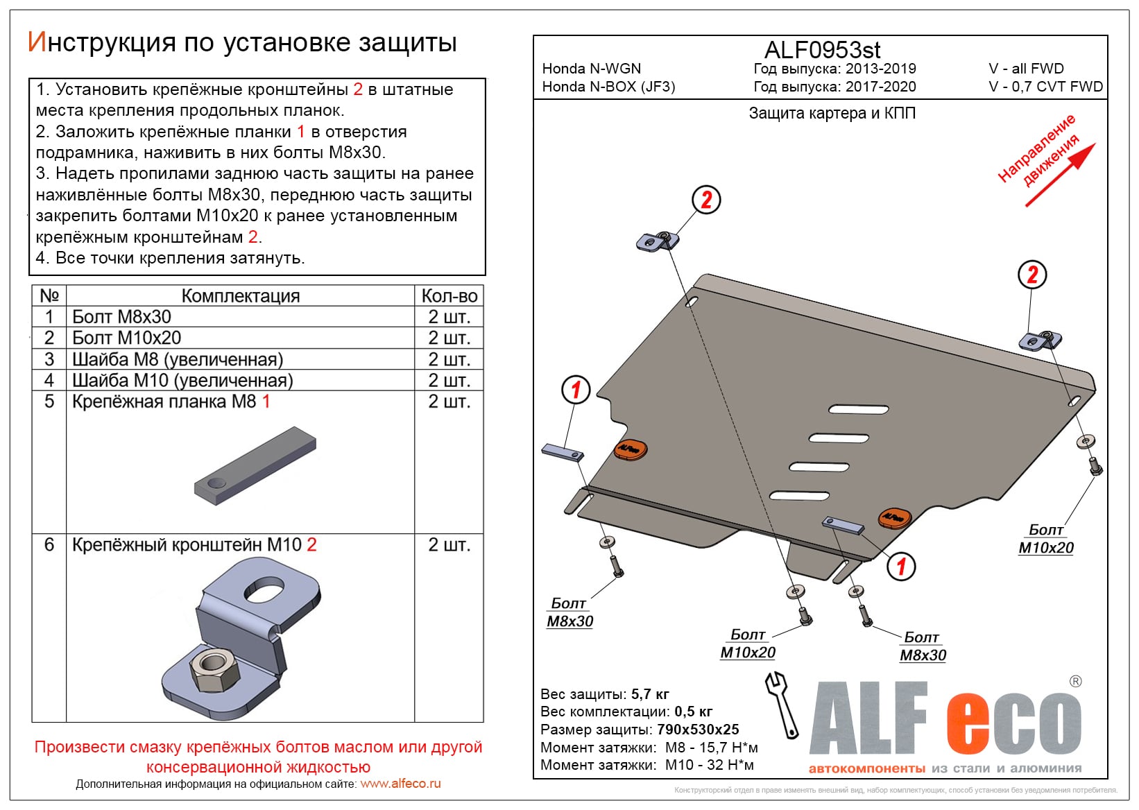 Защита картера и КПП ALFeco арт. ALF0953al изготовлена из алюминия толщиной 4мм специально для автомобиля Honda N-WGN 2013-2019. Обеспечивает надежную защиту агрегатов от механических повреждений и попадания дорожной грязи и других предметов, встречающихся на проезжей части, способных зачастую нанести серьезный вред автомобилю. В комплекте идет весь необходимый крепеж для установки. Наличие можно уточнить по телефону. Возможна установка в нашем автосервисе по предварительной записи