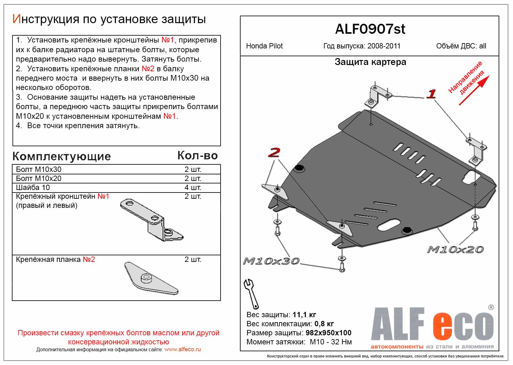 Защита картера и КПП ALFeco арт. ALF0907al изготовлена из алюминия толщиной 4мм специально для автомобиля Honda Pilot II 2008-2011. Обеспечивает надежную защиту агрегатов от механических повреждений и попадания дорожной грязи и других предметов, встречающихся на проезжей части, способных зачастую нанести серьезный вред автомобилю. В комплекте идет весь необходимый крепеж для установки. Наличие можно уточнить по телефону. Возможна установка в нашем автосервисе по предварительной записи