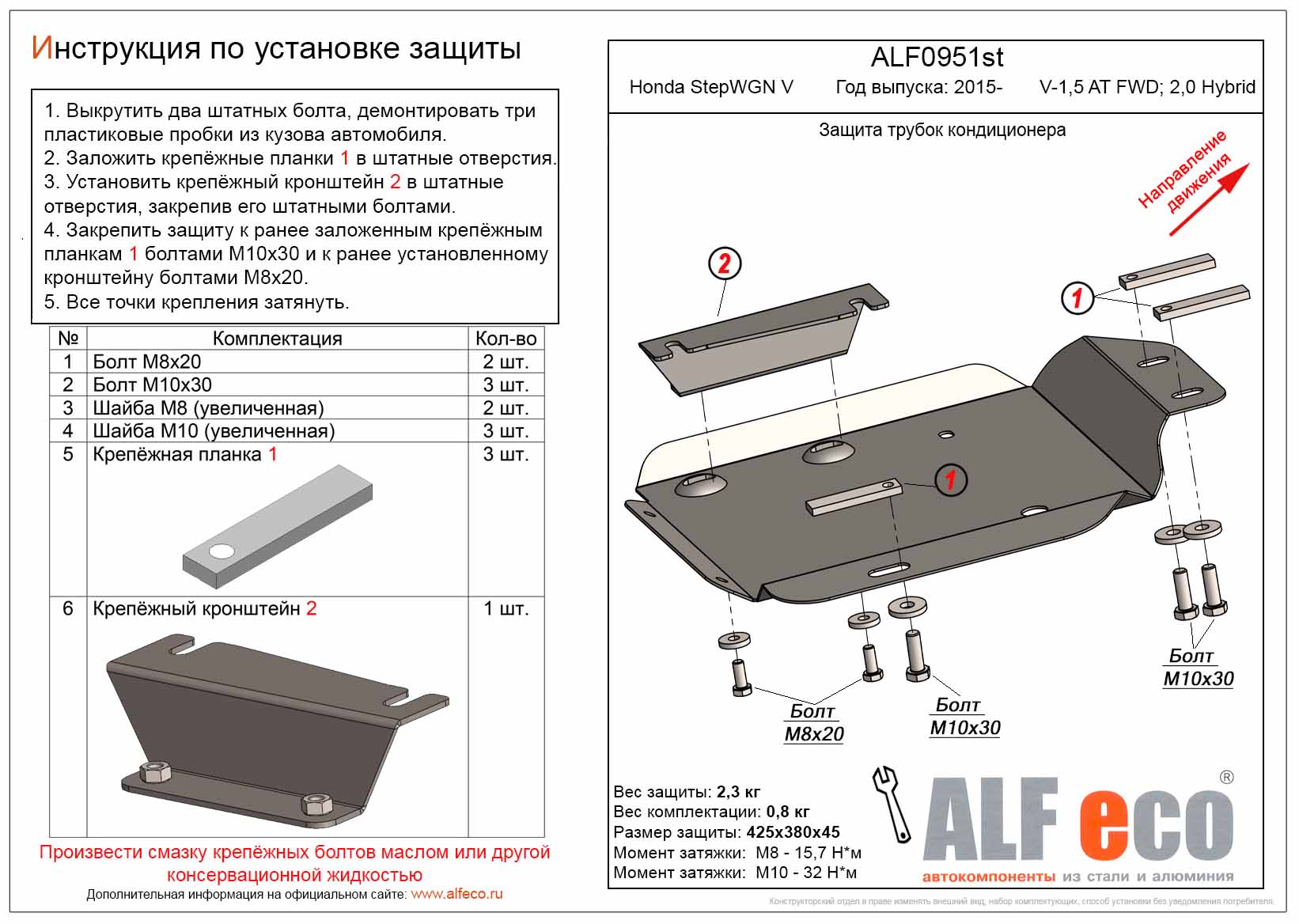 Защита трубок кондиционера ALFeco арт. ALF0951st изготовлена из стали толщиной 2мм специально для автомобиля Honda StepWGN V 2015-2021. Обеспечивает надежную защиту агрегатов от механических повреждений и попадания дорожной грязи и других предметов, встречающихся на проезжей части, способных зачастую нанести серьезный вред автомобилю.