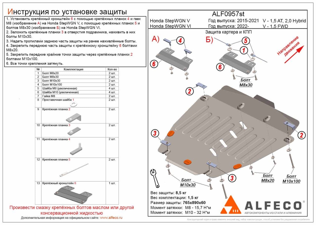 Защита картера и КПП Honda StepWGN VI 2022- V-1,5 FWD , ALFeco, алюминий 4мм, арт. ALF0957al