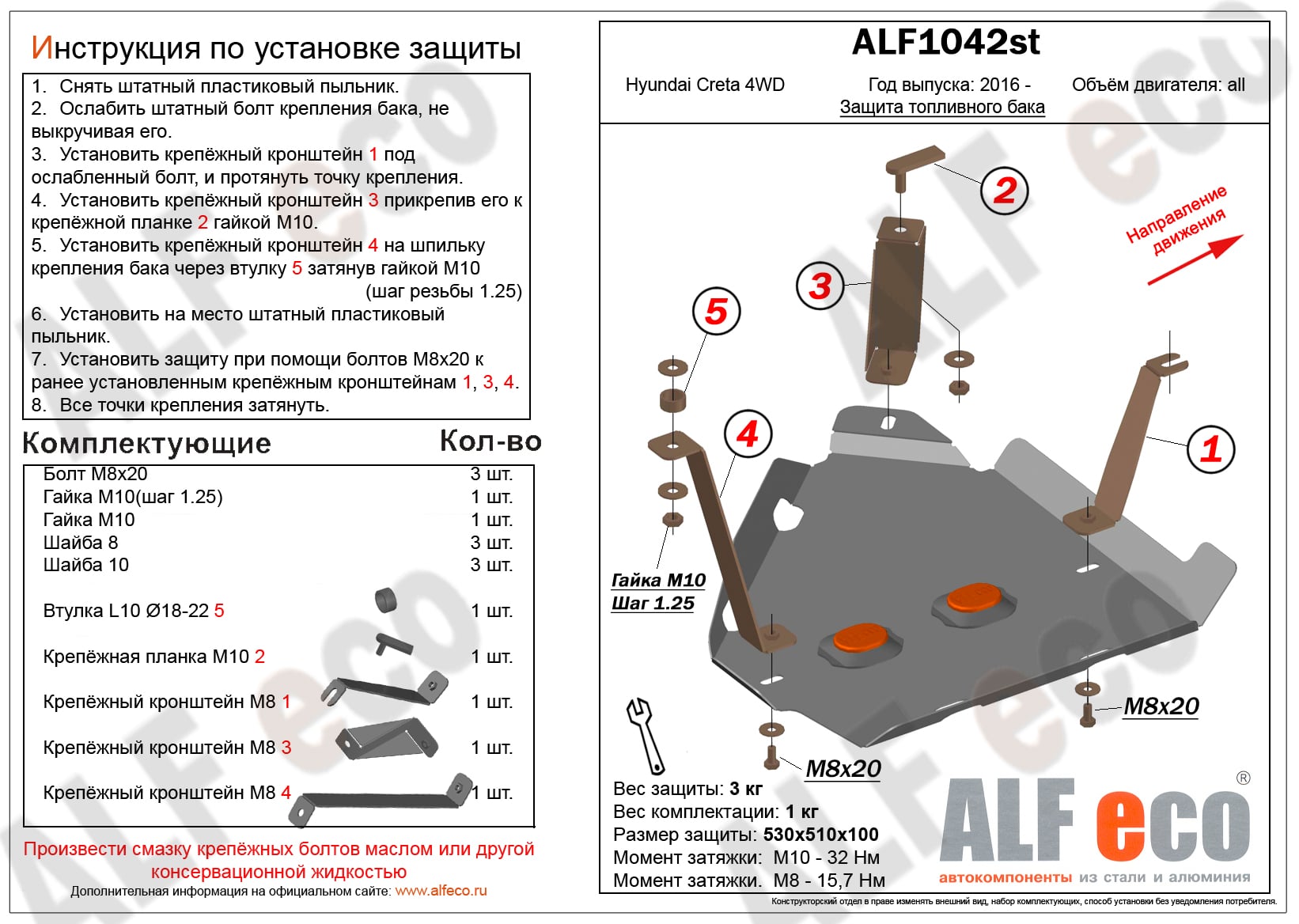 Защита топливного бака ALFeco арт. ALF1042st изготовлена из стали толщиной 1.5мм специально для автомобиля Hyundai Creta 4WD 2015-2021. Обеспечивает надежную защиту агрегатов от механических повреждений и попадания дорожной грязи и других предметов, встречающихся на проезжей части, способных зачастую нанести серьезный вред автомобилю. В комплекте идет весь необходимый крепеж для установки. Наличие можно уточнить по телефону. Возможна установка в нашем автосервисе по предварительной записи
