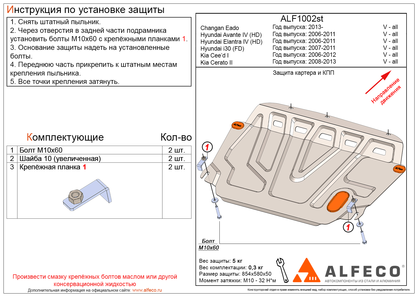 Защита картера и КПП ALFeco арт. ALF1002st изготовлена из стали толщиной 1.5мм специально для автомобиля Hyundai Elantra IV (HD) 2006-2011. Обеспечивает надежную защиту агрегатов от механических повреждений и попадания дорожной грязи и других предметов, встречающихся на проезжей части, способных зачастую нанести серьезный вред автомобилю.