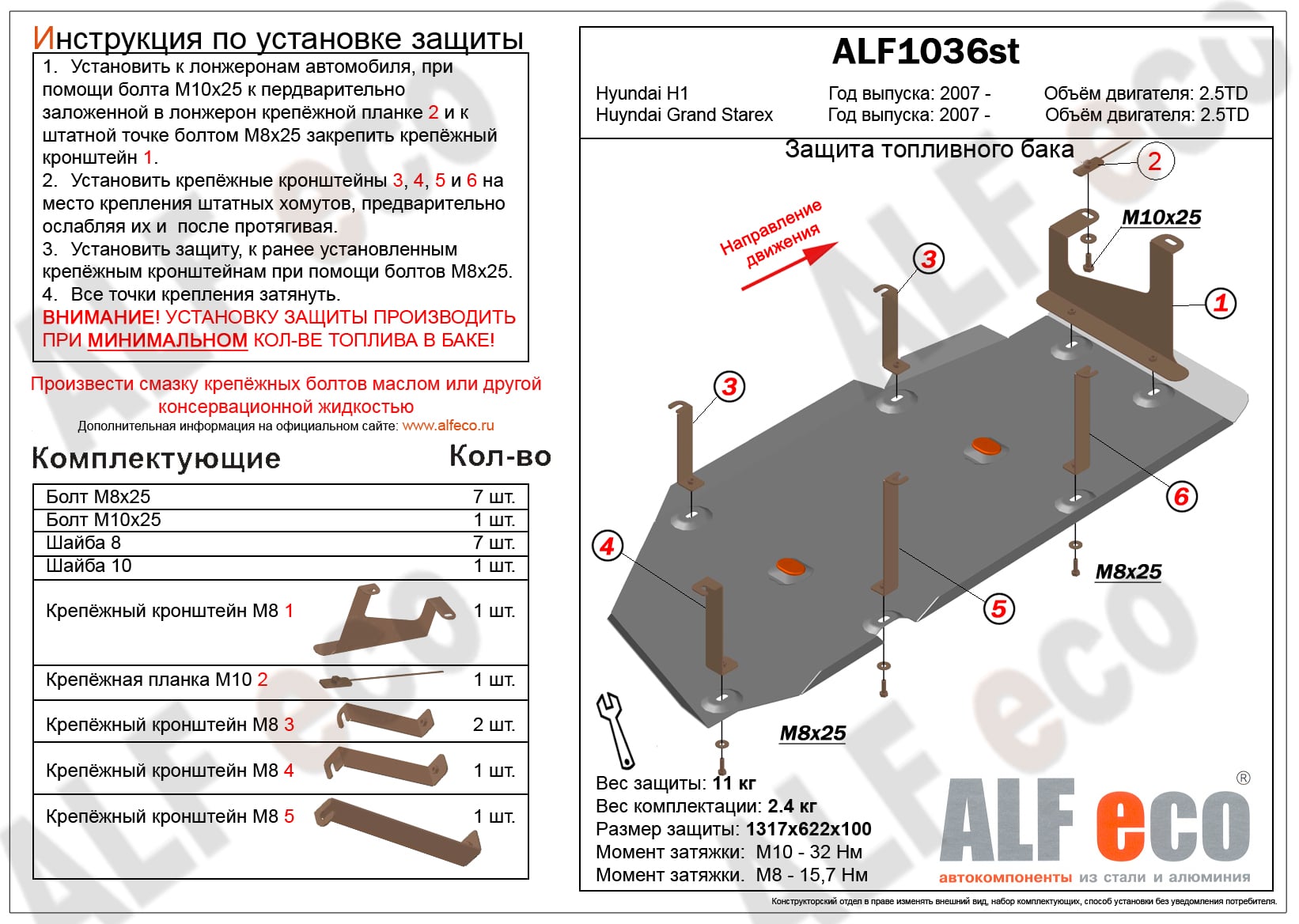 Защита топливного бака ALFeco арт. ALF1036al-1 изготовлена из алюминия толщиной 4мм специально для автомобиля Hyundai H1 2007-2018. Обеспечивает надежную защиту агрегатов от механических повреждений и попадания дорожной грязи и других предметов, встречающихся на проезжей части, способных зачастую нанести серьезный вред автомобилю. В комплекте идет весь необходимый крепеж для установки. Наличие можно уточнить по телефону. Возможна установка в нашем автосервисе по предварительной записи