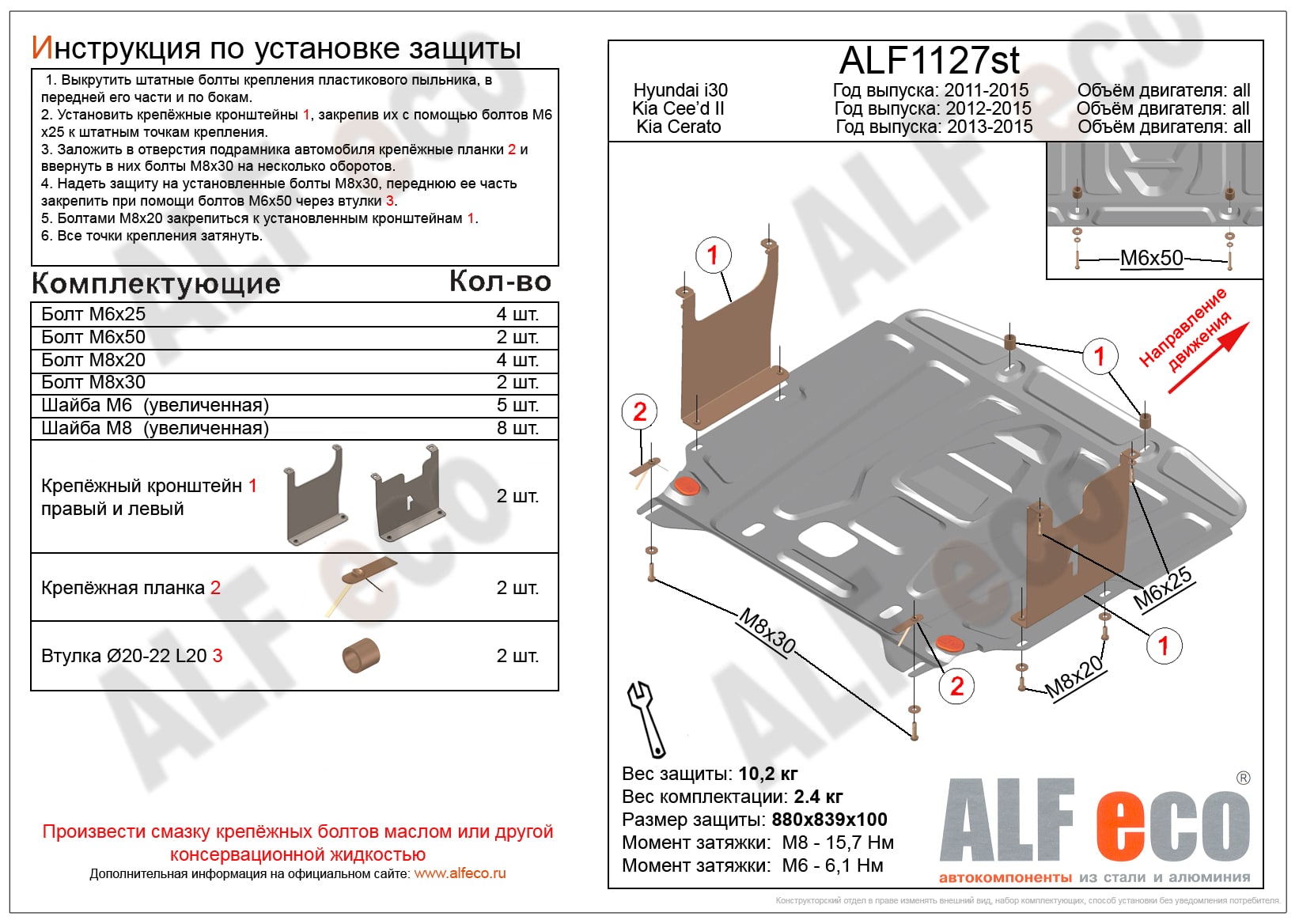 Защита картера и КПП ALFeco арт. ALF1127st изготовлена из стали толщиной 2мм специально для автомобиля Hyundai i30 (GD) 2011-2015. Обеспечивает надежную защиту агрегатов от механических повреждений и попадания дорожной грязи и других предметов, встречающихся на проезжей части, способных зачастую нанести серьезный вред автомобилю. В комплекте идет весь необходимый крепеж для установки. Наличие можно уточнить по телефону. Возможна установка в нашем автосервисе по предварительной записи