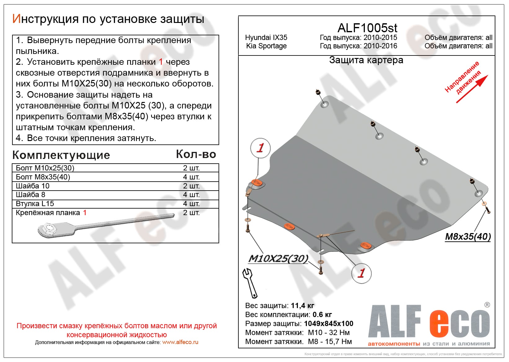 Защита картера и КПП (большая) ALFeco арт. ALF1005st изготовлена из стали толщиной 2мм специально для автомобиля Hyundai IX35 2009-2015. Обеспечивает надежную защиту агрегатов от механических повреждений и попадания дорожной грязи и других предметов, встречающихся на проезжей части, способных зачастую нанести серьезный вред автомобилю. В комплекте идет весь необходимый крепеж для установки. Наличие можно уточнить по телефону. Возможна установка в нашем автосервисе по предварительной записи