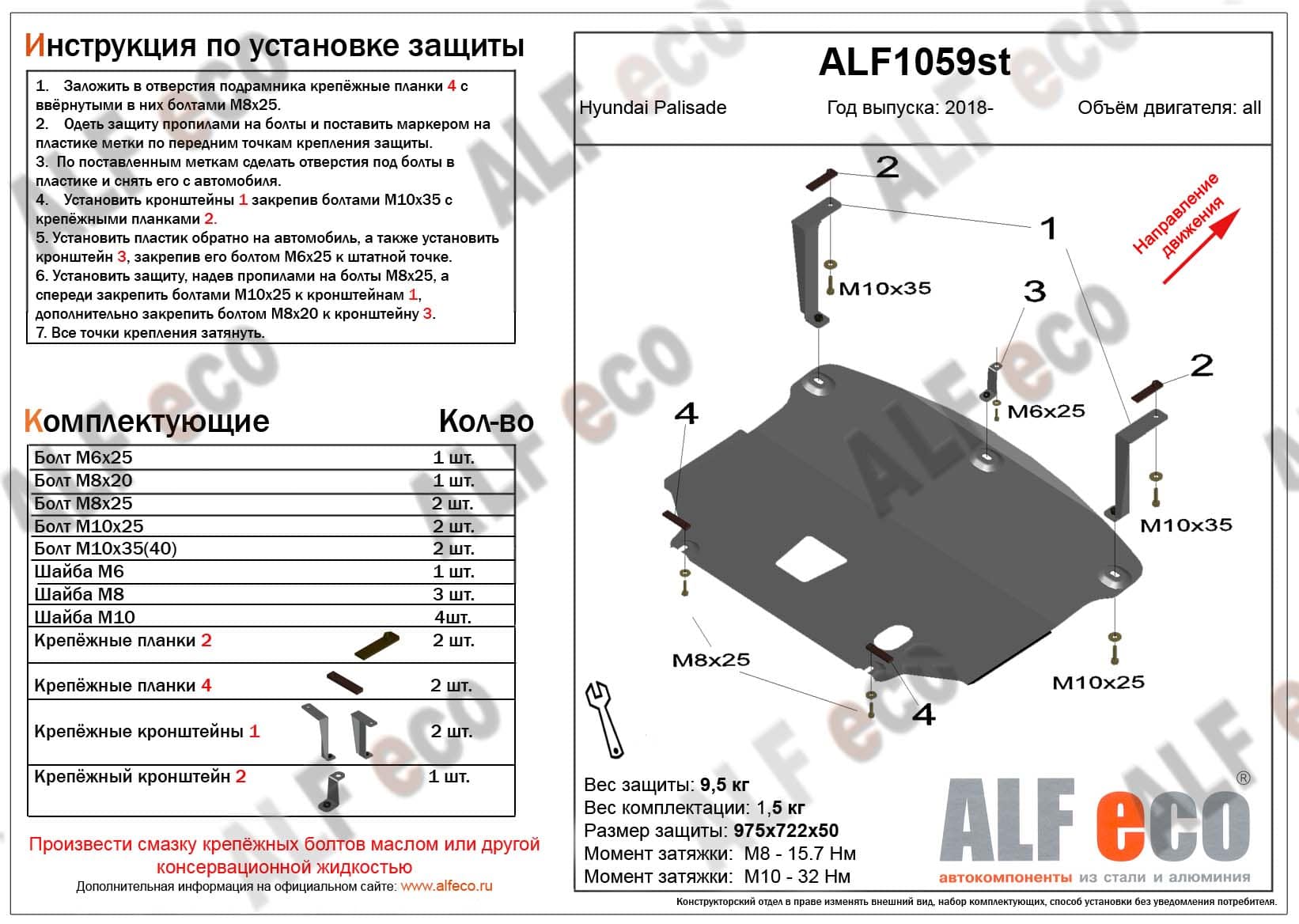 Защита картера и КПП ALFeco арт. ALF1059st изготовлена из стали толщиной 2мм специально для автомобиля Hyundai Palisade 2020-. Обеспечивает надежную защиту агрегатов от механических повреждений и попадания дорожной грязи и других предметов, встречающихся на проезжей части, способных зачастую нанести серьезный вред автомобилю. В комплекте идет весь необходимый крепеж для установки. Наличие можно уточнить по телефону. Возможна установка в нашем автосервисе по предварительной записи