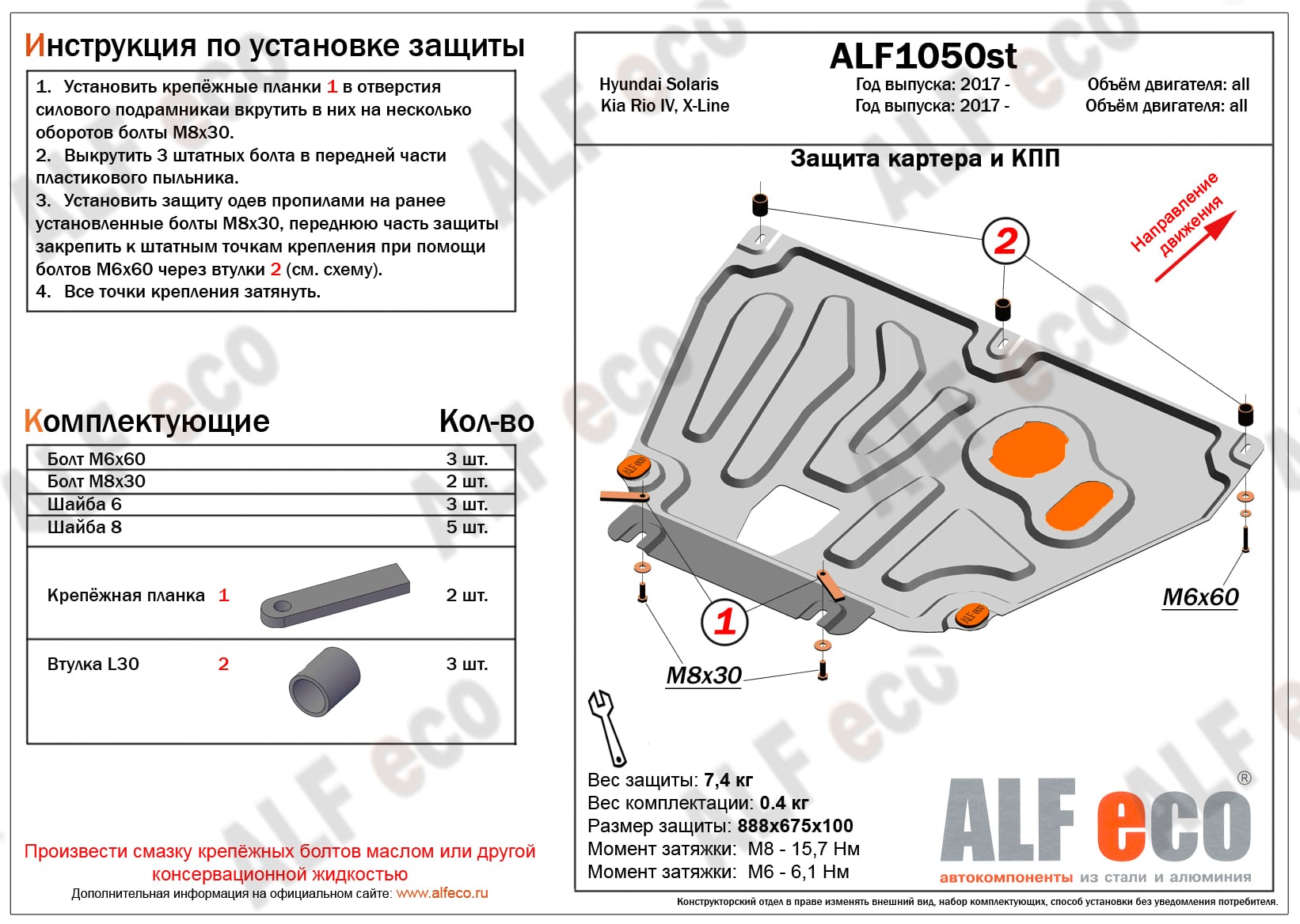Защита картера и КПП (установка на пыльник, на штатные точки) ALFeco арт. ALF1050al изготовлена из алюминия толщиной 4мм специально для автомобиля Hyundai Solaris 2017- 2022. Обеспечивает надежную защиту агрегатов от механических повреждений и попадания дорожной грязи и других предметов, встречающихся на проезжей части, способных зачастую нанести серьезный вред автомобилю. В комплекте идет весь необходимый крепеж для установки. Наличие можно уточнить по телефону. Возможна установка в нашем автосервисе по предварительной записи