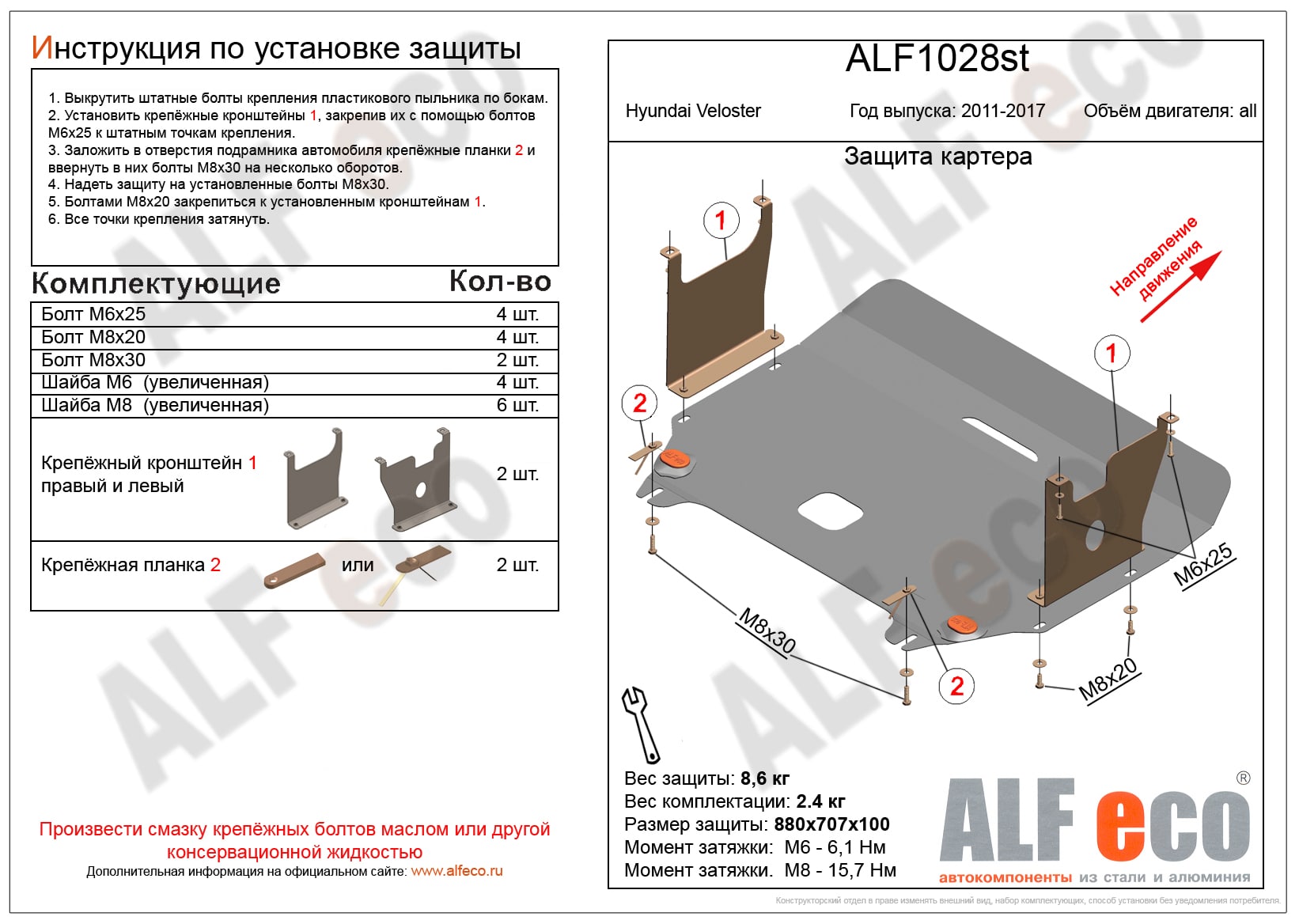 Защита картера и КПП ALFeco арт. ALF1028al изготовлена из алюминия толщиной 4мм специально для автомобиля Hyundai Veloster 2012-2016. Обеспечивает надежную защиту агрегатов от механических повреждений и попадания дорожной грязи и других предметов, встречающихся на проезжей части, способных зачастую нанести серьезный вред автомобилю. В комплекте идет весь необходимый крепеж для установки. Наличие можно уточнить по телефону. Возможна установка в нашем автосервисе по предварительной записи