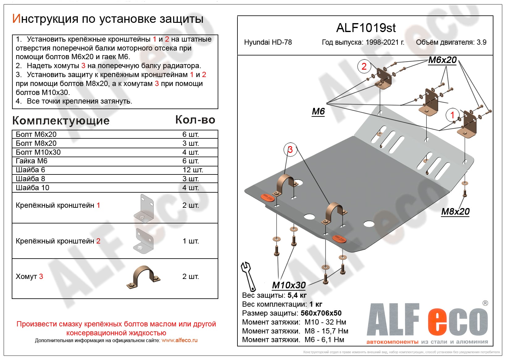 Защита радиатора ALFeco арт. ALF1019st изготовлена из стали толщиной 2мм специально для автомобиля Hyundai HD-78 1998-2021. Обеспечивает надежную защиту агрегатов от механических повреждений и попадания дорожной грязи и других предметов, встречающихся на проезжей части, способных зачастую нанести серьезный вред автомобилю. В комплекте идет весь необходимый крепеж для установки. Наличие можно уточнить по телефону. Возможна установка в нашем автосервисе по предварительной записи