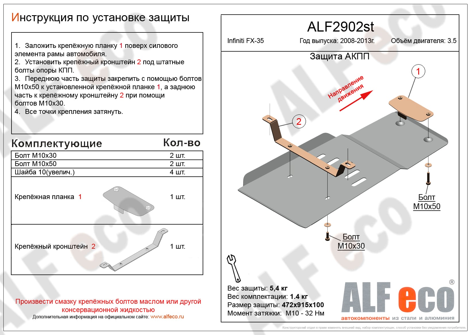 Защита АКПП ALFeco арт. ALF2902al изготовлена из алюминия толщиной 4мм специально для автомобиля Infiniti FX35 II 2008-2012. Обеспечивает надежную защиту агрегатов от механических повреждений и попадания дорожной грязи и других предметов, встречающихся на проезжей части, способных зачастую нанести серьезный вред автомобилю. В комплекте идет весь необходимый крепеж для установки. Наличие можно уточнить по телефону. Возможна установка в нашем автосервисе по предварительной записи