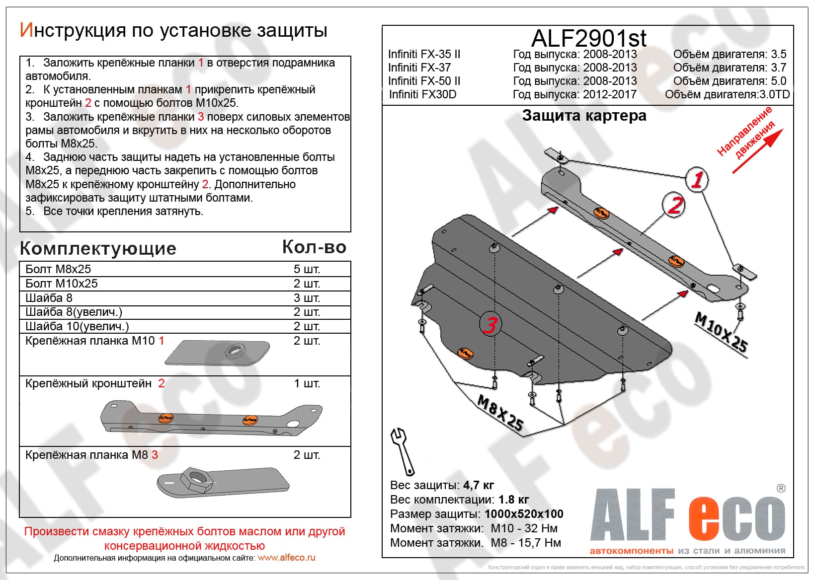 Защита картера ALFeco арт. ALF2901st изготовлена из стали толщиной 2мм специально для автомобиля Infiniti FX30D 2012-2017. Обеспечивает надежную защиту агрегатов от механических повреждений и попадания дорожной грязи и других предметов, встречающихся на проезжей части, способных зачастую нанести серьезный вред автомобилю. В комплекте идет весь необходимый крепеж для установки. Наличие можно уточнить по телефону. Возможна установка в нашем автосервисе по предварительной записи